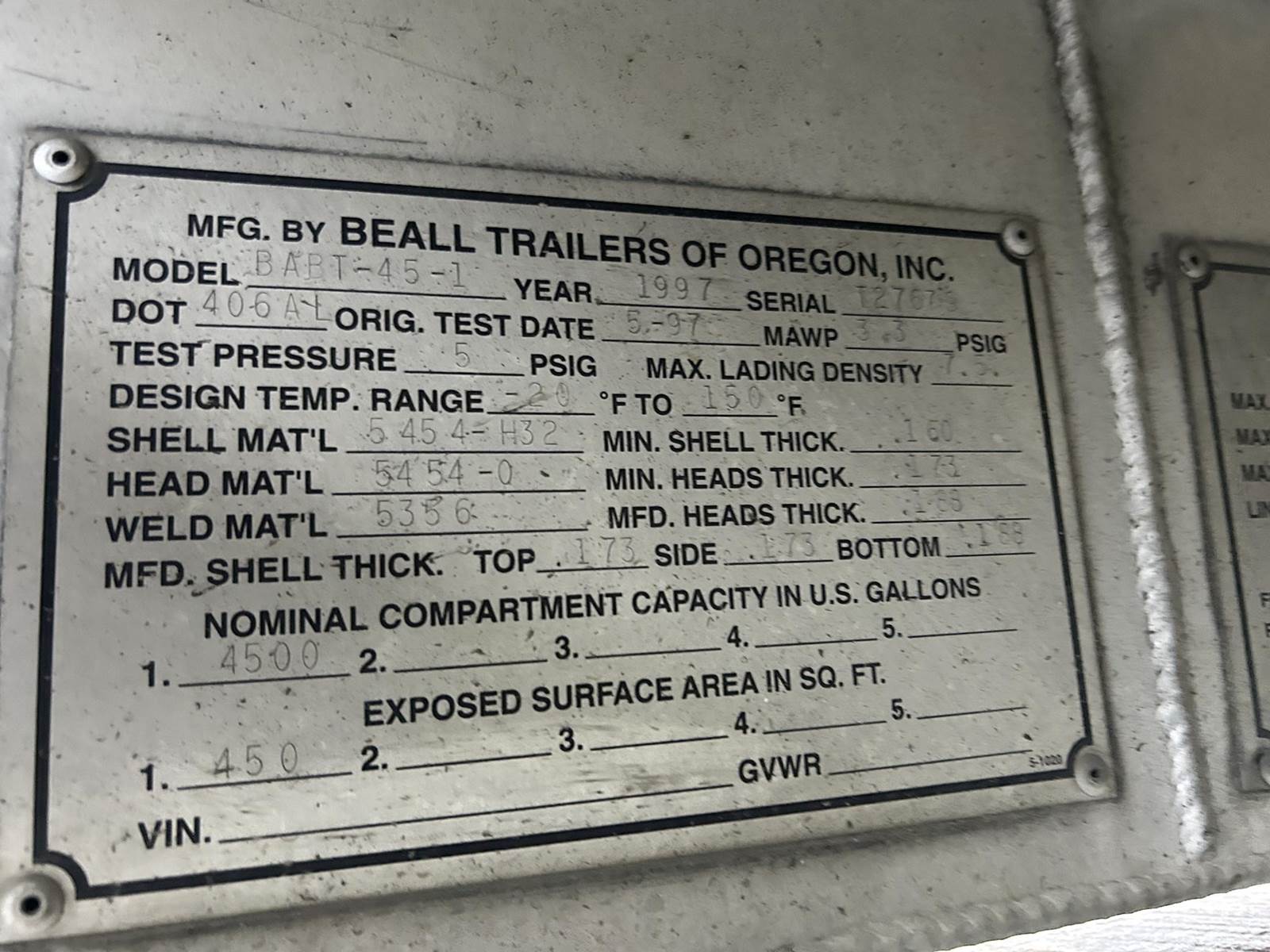 1997 BEALL 4500 GAL. SINGLE COMPT. ALUMINUM TRUCK TANK