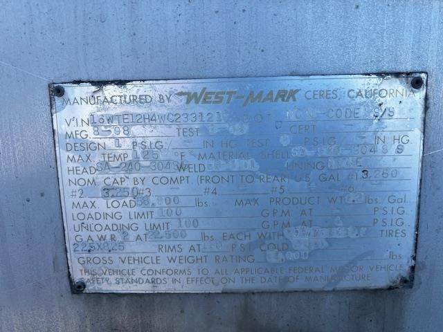 1998 WESTMARK 6,500 GAL., 2-COMPT., 2-AXLE SS EXTERNAL RING FOOD GRADE SEMI TANK TRAILER