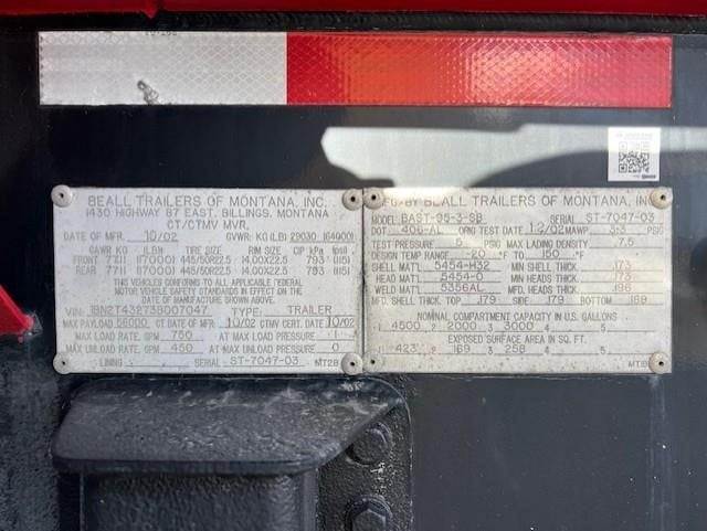 (Mfg. 12/02), Serial# ST-7047-03, Model# BAST-95-3-SB, DOT406AL, 4" API Combo Bottom Load/Unload Heads, Roto Tags, LED Work Light @ Load Heads, Vapor Recovery, Brake Interlock Bar, 3" Forward & Rear Pump Line, Offside Gravity Drops & Vapor Recovery, Pintle Hitch w/ Gladhands & 7-Way Plug, Aluminum Fenders, L/H Hose Tube, R/H Hose Tube over Front Fender, R/H Cone & Bucket Holder, (2) R/H Stacked Hose Tubes, R/H Aluminum Fitting Box, Aluminum Ladder @ Front of Trailer.....
