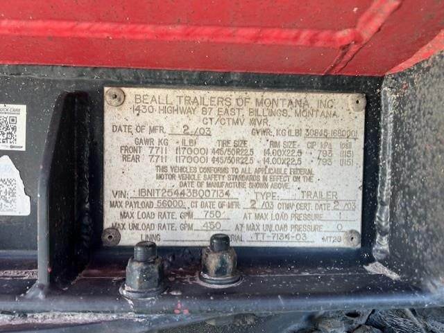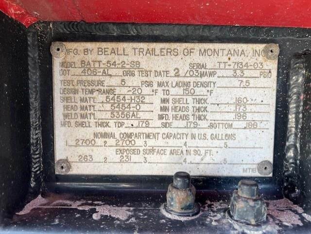 (Mfg. 2/03), Serial# TT-7134-03, Model# BATT-54-2-SB, DOT406AL, 5400 Gallon, 2-Compartment (2700,2700), Double Bulkhead, 4" API Combo Bottom Load/Unload Heads w/ Brake Interlock, Work Light @ Load Heads, Vapor Recovery w/ Brake Interlock, 3" Forward Pump Line, Offside Gravity Drops & Vapor Recovery, Work Light @ Offside Plumbing, Spring Suspension, 295/75R22.5 Tires on All Aluminum Wheels, Cam Style Brakes, Aluminum Fenders, L/H Hose Tube, R/H Hose Tube, R/H Aluminum Fitting Box, Aluminum Ladder @ Front of Trailer.....