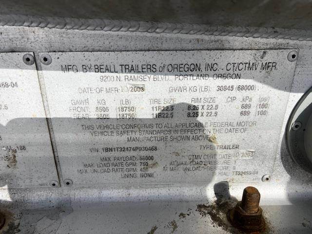 (Mfg. 10/03), Serial# TT30468-04, Model# BATT-74-3-DC, DOT406AL, 7400 Gallon, 3-Compartment (2800,1500,3100), All Double Bulkheads, Air Operated Internals, 4" API 'Y' Bottom Load Heads w/ Brake Interlock, Roto Tags, Work Light @ Load Heads, Vapor Recovery w/ Brake Interlock, 3" Forward & Rear Pump Line, FloTech Overfill Monitor, Optic & Thermistor Socket, Offside Gravity Drops & Vapor Recovery, Spring Suspension, 11R22.5 Tires on All Aluminum Wheels, Cam Style Brakes, Pintle Hitch @ Rear w/ Gladhands & 7-Way Plug, Adjustable Draw Bar, Aluminum Fenders, L/H Chain Hangers, (2) R/H Stacked Hose Tubes w/ Fitting Box @ End, R/H Chain Hangers, Aluminum Ladder @ Front of Trailer.....