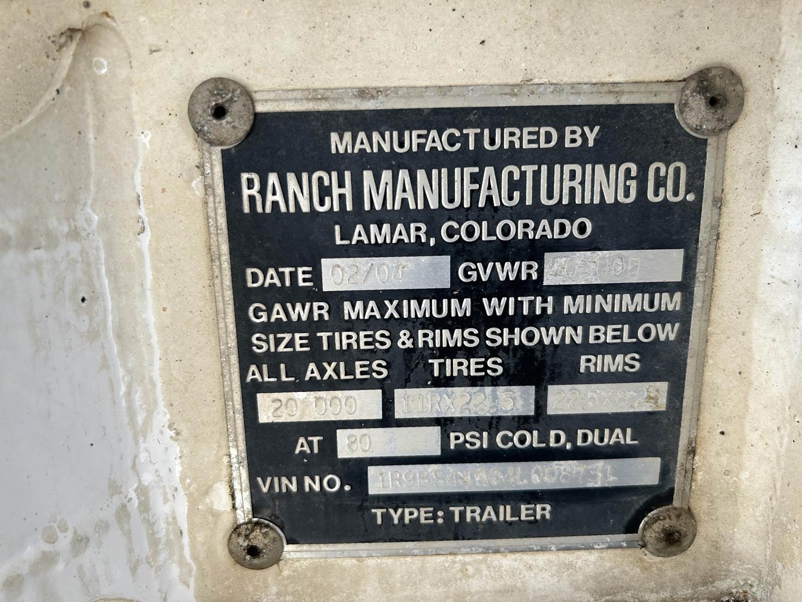 (Mfg. 2/04), 20,000# GAWR, 40,000# GVWR, Clam Gates, Spring Ride Suspension, 11R22.5 Tires on Aluminum Wheels, Cam Style Drum Brakes, Tarp System, Pintle Hook Hitch @ Rear w/ 7-Way Socket & Gladhand Hookups...