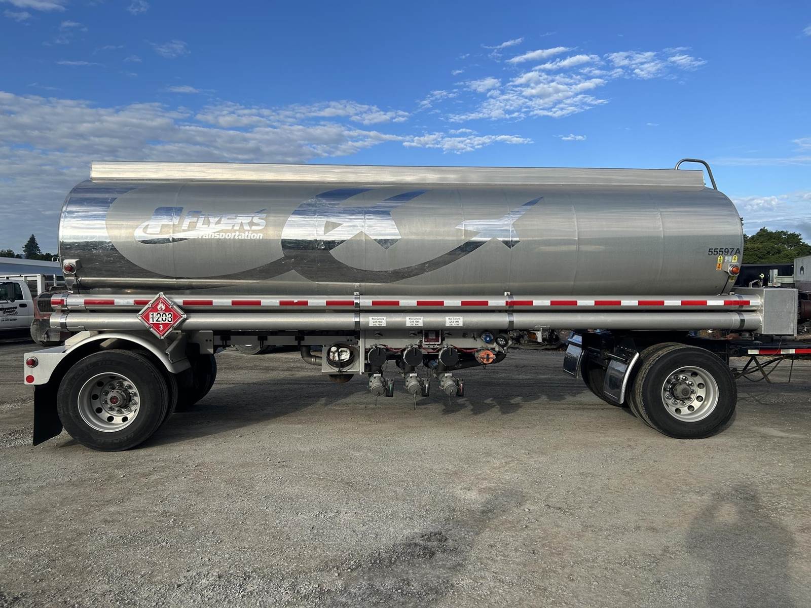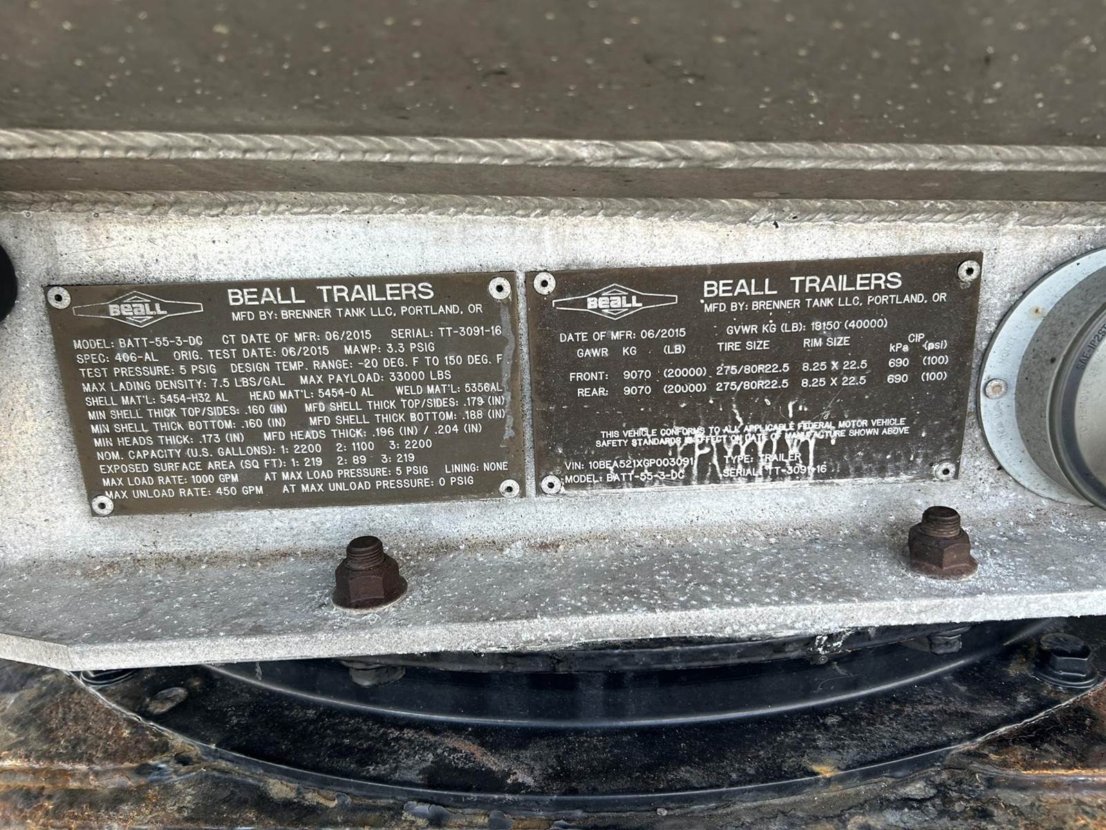 (Mfg. 6/15), Serial# TT-3091-16, Model# BATT-55-3-DC, DOT406AL, 5500 Gallon, 3-COmpartment (2200,1100,2200), All Double Bulkheads, Air Operated Internals, 4" API 'Y' Bottom Load Heads w/ Brake Interlock & Sight Glasses, Work Light @ Load Heads, Vapor Recovery w/ Brake Interlock, FloTech Overfill Monitor, Optic Socket, Offside Gravity Drops & Vapor Recovery, Air Ride Suspension, 295/75R22.5 Tires on All Aluminum Wheels, Cam Style Brakes, Aluminum Rear Fenders, Stainless Steel Front Quarter Fenders, L/H Chain Hangers, (2) R/H Stacked Hose Tubes w/ Fitting Box, R/H Chain Hanger, Aluminum Ladder @ Front of Tank.....