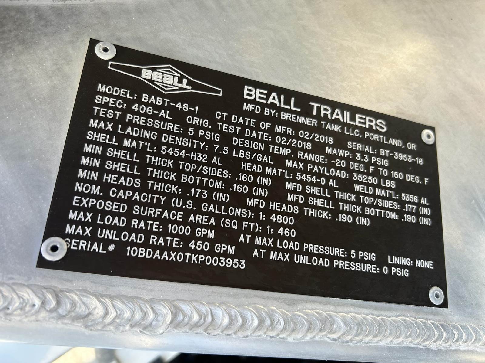2018 BEALL 4800 GAL. SINGLE COMPARTMENT ALUMINUM TRUCK TANK