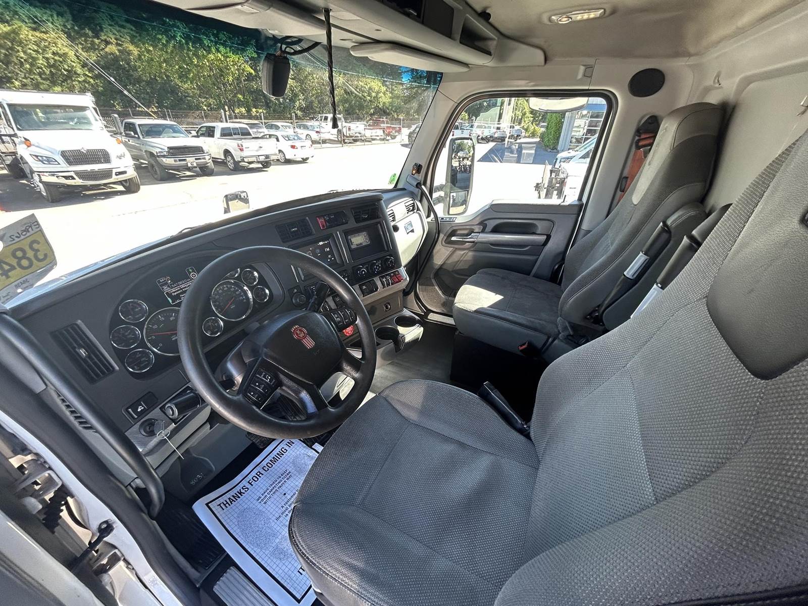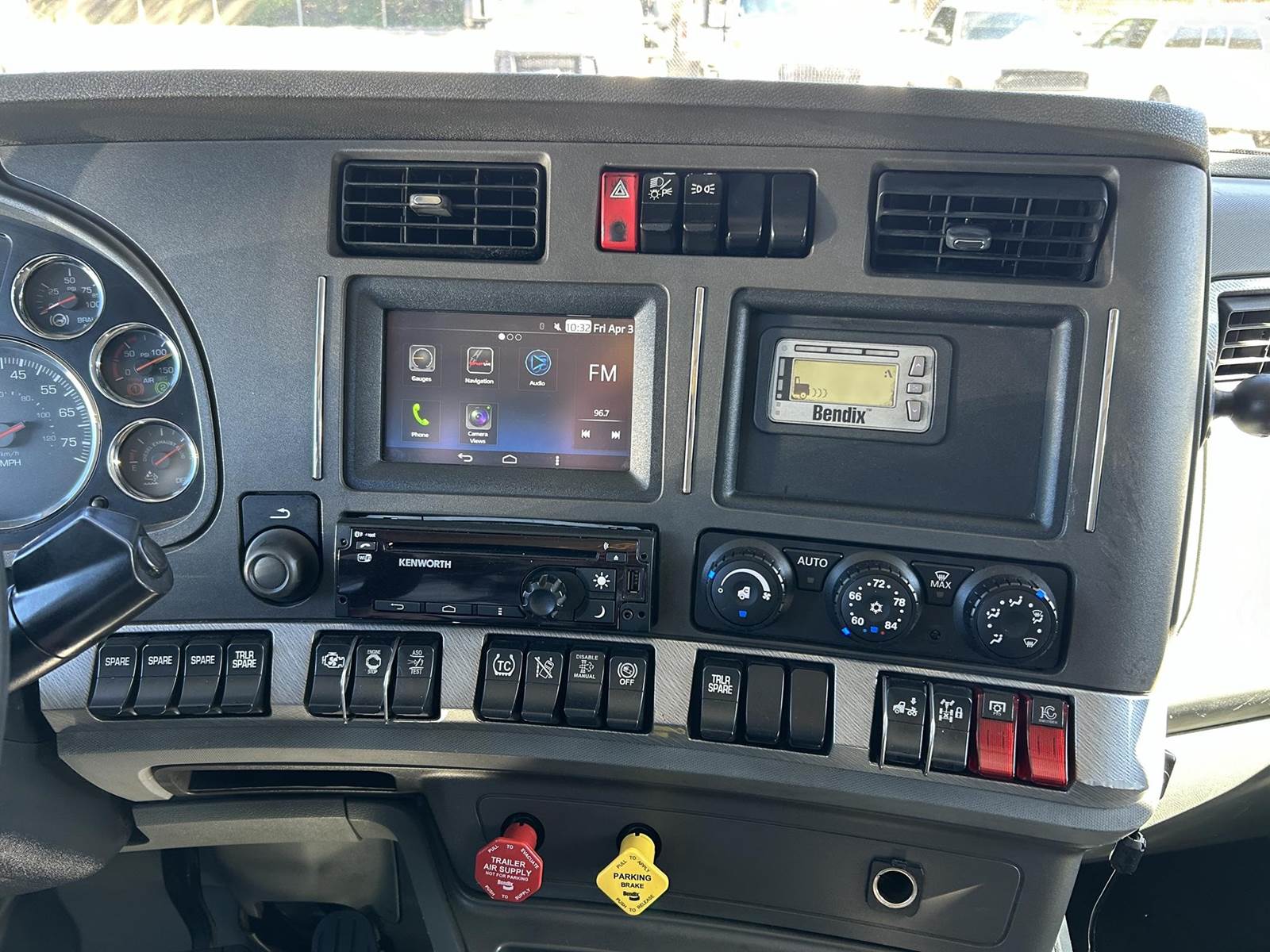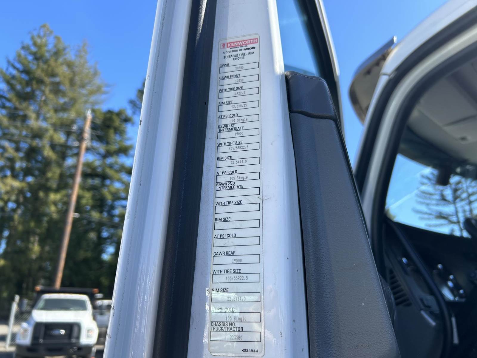 MX11 (400 HP), Engine Brake, Eaton-Fuller Advantage 10-Speed Automated Transmission, Meritor RT40-145A 38,000# Dual Drive Rear Axles (4.11 Ratio), Inter-Axle Differential, Paccar Flex Air Suspension w/ Dash Deflate Switch, 12,350# Steer Axle w/ Power Steering, 455/50R22.5 Super Single Drive Tires, 22.5 Steer Tires, Disc Brakes, L/H Aluminum Battery Box w/ Steps under Driver Side Door, Battery Disconnect Switch, L/H Frame Mounted DEF Tank, L/H Aluminum Frame Mounted 75 Gal. Fuel Tank, L/H & R/H Hood Mounted Spot Mirrors, Single R/H Upright Chrome Exhaust w/ Factory Installed DPF, R/H Aluminum Frame Mounted Tool Box, R/H Side Mounted GreaseJockey Auto-Greasing Unit, Stainless Steel Visor, Factory Air Ride Day Cab, DOT Rear Bumper w/ Pintle Hitch, Glad Hands & 7-Way Plug, Day Light Doors, Air Ride Seat, Tilt & Tele Steering Column, Power Door Locks, Power Windows, Power Mirrors, Heated Mirrors, A/C, Cruise Control, Lane-Keeping Assist w/ Dash Switch, Traction Control w/ Dash Switch, Hill-Start Assist w/ Dash Switch, Bendix Blindspotter w/ Dash Mounted Driver Interface Unit, Kenworth Nav+HD Infotainment System w/ AM/FM Radio/CD Player/Aux/Bluetooth/USB.....