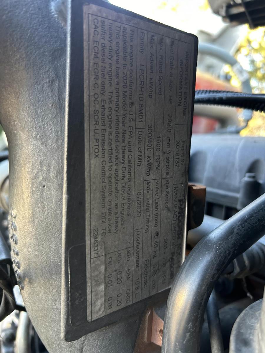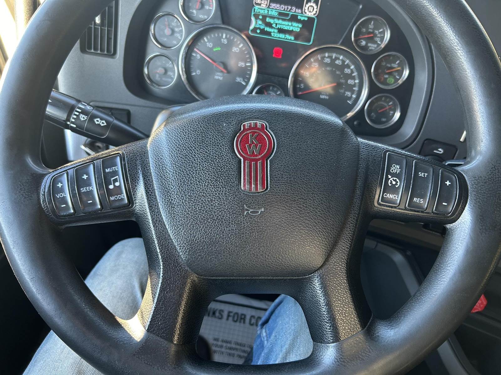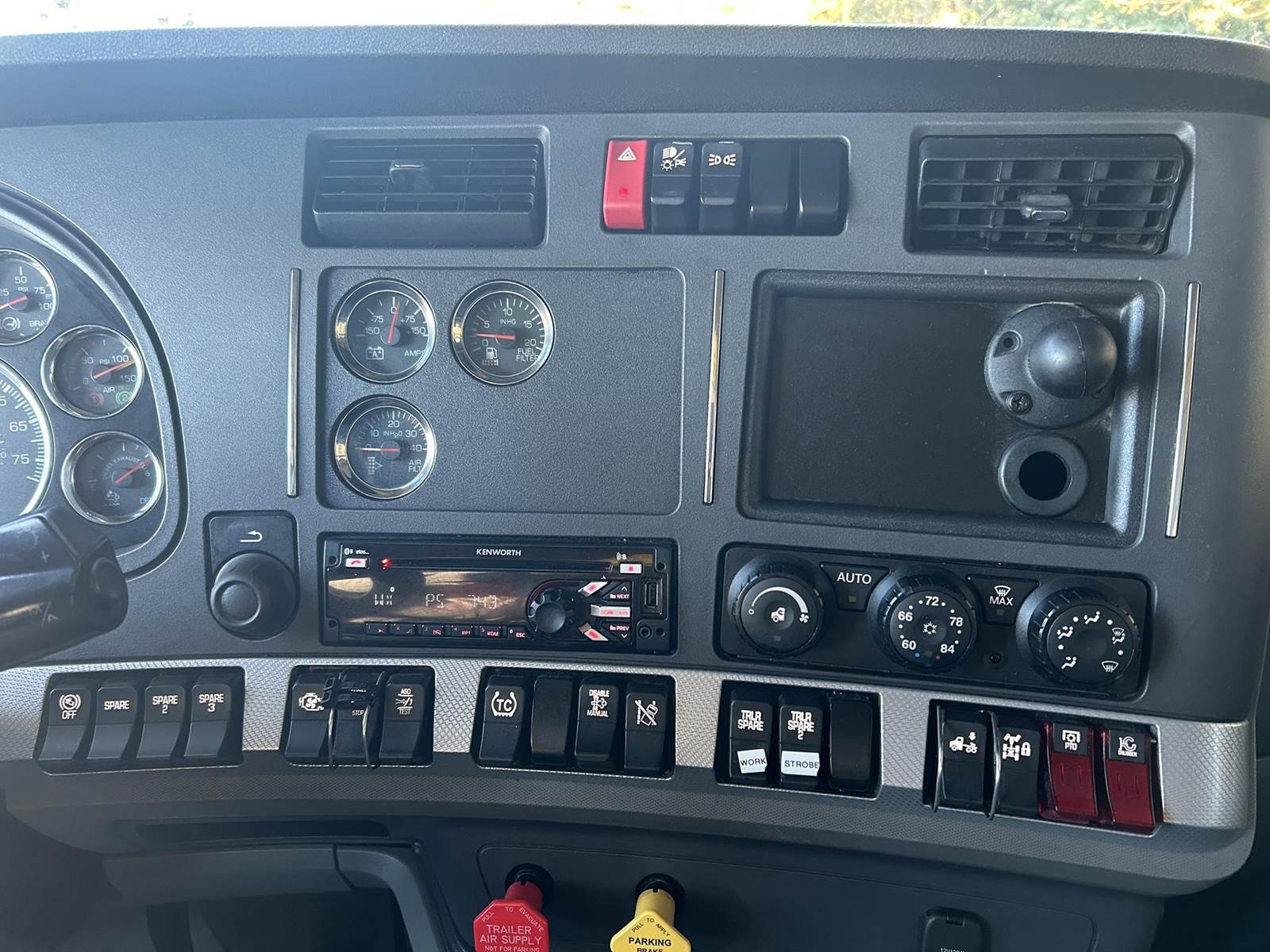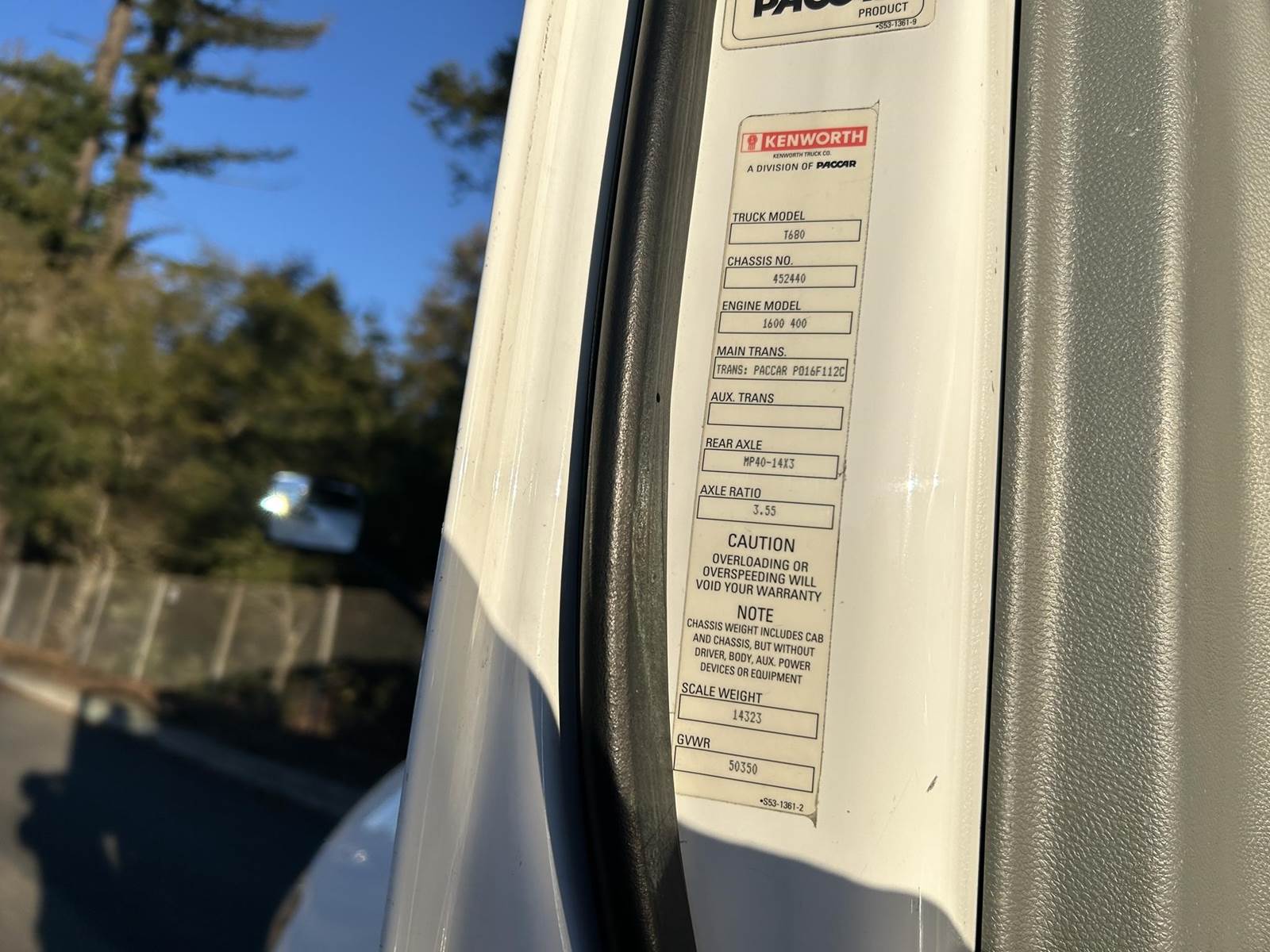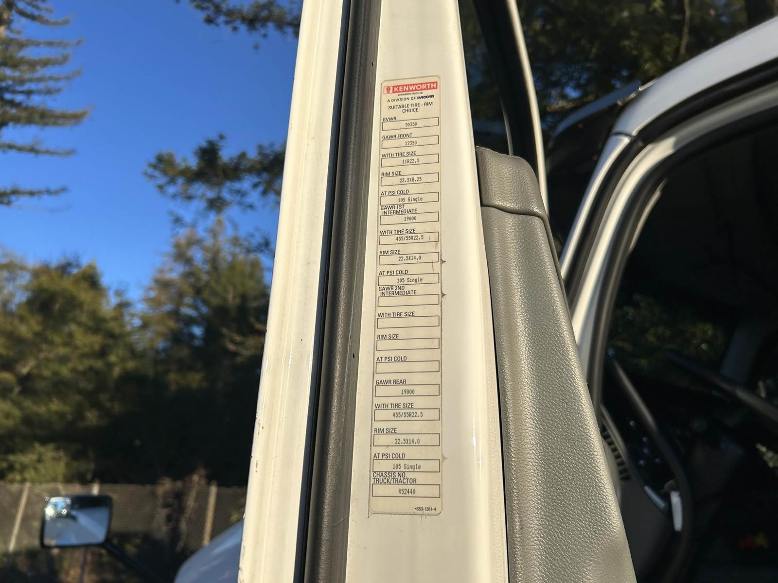 MX11 (400 HP), Engine Brake, Paccar PO-16F112C Automatic Transmission, Meritor MP40-14X3 38,000# Dual Drive Rear Axles (3.55 Ratio), Inter-Axle Differential, Paccar Flex Air Suspension w/ Dash Deflate Switch, 12,350# Steer Axle w/ Power Steering, 445/50R22.5 Super Single Drive Tires, 22.5 Steer Tires, Disc Brakes, L/H Aluminum Battery Box w/ Steps under Driver Side Door, Battery Disconnect Switches, L/H Frame Mounted DEF Tank, L/H Aluminum Frame Mounted 75 Gal. Fuel Tank, L/H & R/H Hood Mounted Spot Mirrors, Single R/H Upright Chrome Exhaust w/ DPF, R/H Aluminum Frame Mounted Tool Box, R/H Side Mounted GreaseJockey Auto-Greasing Unit, Stainless Steel Visor, Air Ride Day Cab, DOT Rear Bumper w/ Pintle Hitch, Glad Hands & 7-Way Plug, Day Light Doors, Air Ride Seat, Tilt & Tele Steering Column, Gauge Package, Power Door Locks, Power Windows, Power Mirrors, Heated Mirrors, A/C, Cruise Control, Lane Assist w/ Dash Switch, Traction Control w/ Dash Switch, Hill-Start Assist w/ Dash Switch, Bendix BlindSpotter w/ Dash Mounted Driver Interface Unit, Kenworth AM/FM Radio w/ CD Player.....