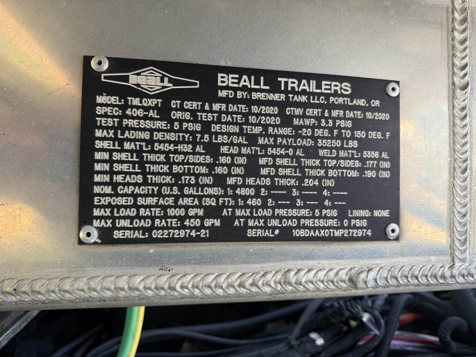 (Mfg. 10/2020 ), Model No. TMLQXPT, Serial #02272974-21, 4800 Gallon, Single Compartment, Air Operated Internal, 4" API 'Y' Bottom Load Head w/ Brake Interlock & Sight Glass, Roto Tag, Vapor Recovery w/ Brake Interlock, Civacon ROM II Overfill Monitor, Optic Socket w/ Brake Interlock, Work Light @ Load Heads, L/H Side Chock Holder, (1) L/H & (1) R/H Side Extinguisher Mount, R/H Side Chevron Style Hose Tray w/ Stick Holder, R/H Side Fitting Box, Aluminum Ladder @ Rear of Tank.....