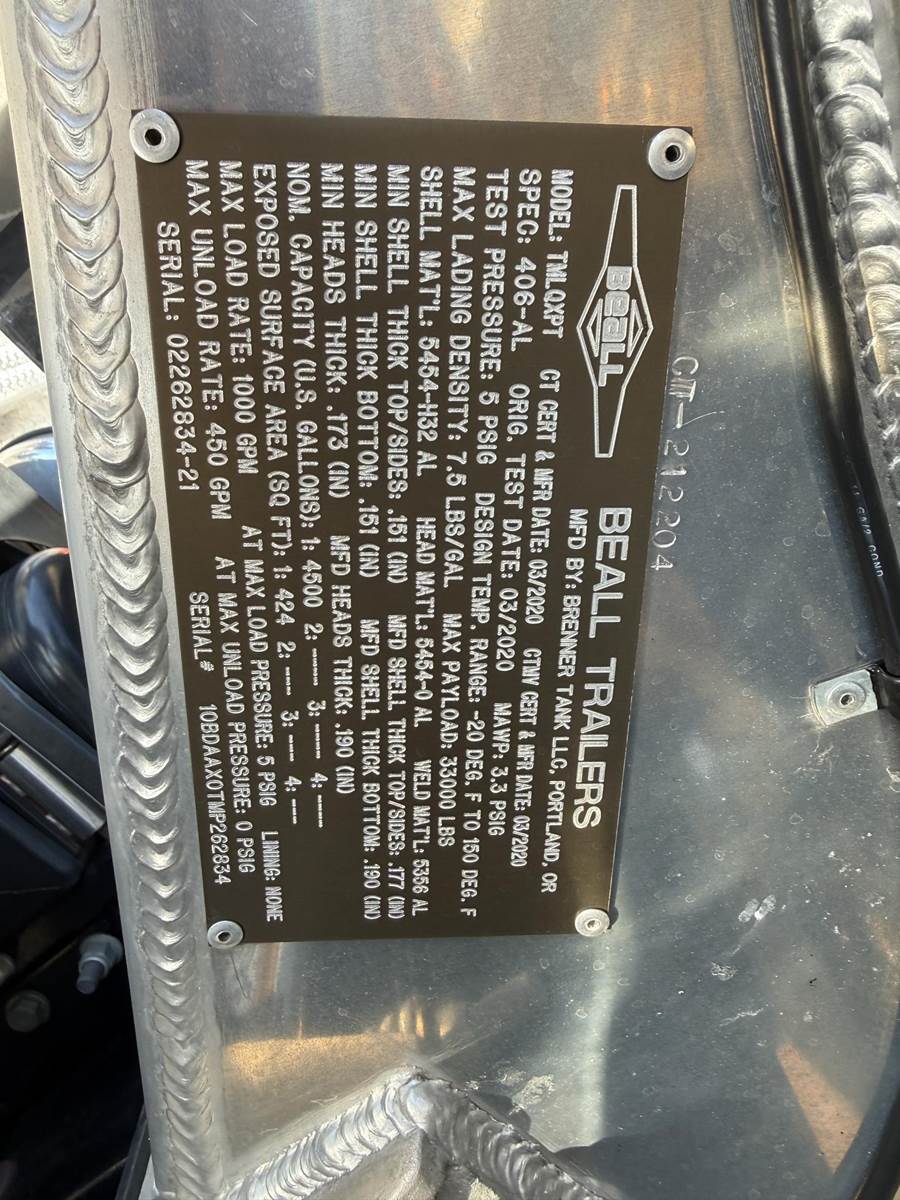 (Mfg. 3/20), Serial# 02262834-21, Model# TMLQXPT, DOT406AL, 4500 Gallon, Single Compartment, Air Operated Internal Valve, 4" API 'Y' Bottom Load Head w/ Brake Interlock & Sight Glass, Roto Tag, Work Light @ Load Head,
