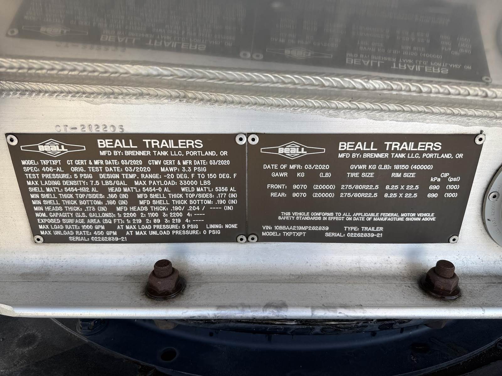 (Mfg. 3/20), Serial# 02262839-21, Model# TKPTXPT, DOT406AL, 5500 Gallon, 3-Compartment (2200,1100,2200), All Double Bulkheads, Air Operated Internals, 4" API 'Y' Bottom Load Heads w/ Sight Glasses, Roto Tags, Work Light @ Load Heads, Vapor Recovery, Brake Interlock Bar, 3" Forward Pump Line, FloTech Overfill Monitor, Optic Socket, Air Ride Suspension, 275/80R22.5 Tires on All Aluminum Wheels, Disc Brakes, Aluminum Fenders, L/H Chain Hanger, R/H Chain Hanger, (2) R/H Stacked Hose Tubes w/ Fitting Box @ End, Aluminum Ladder @ Front of Trailer.....