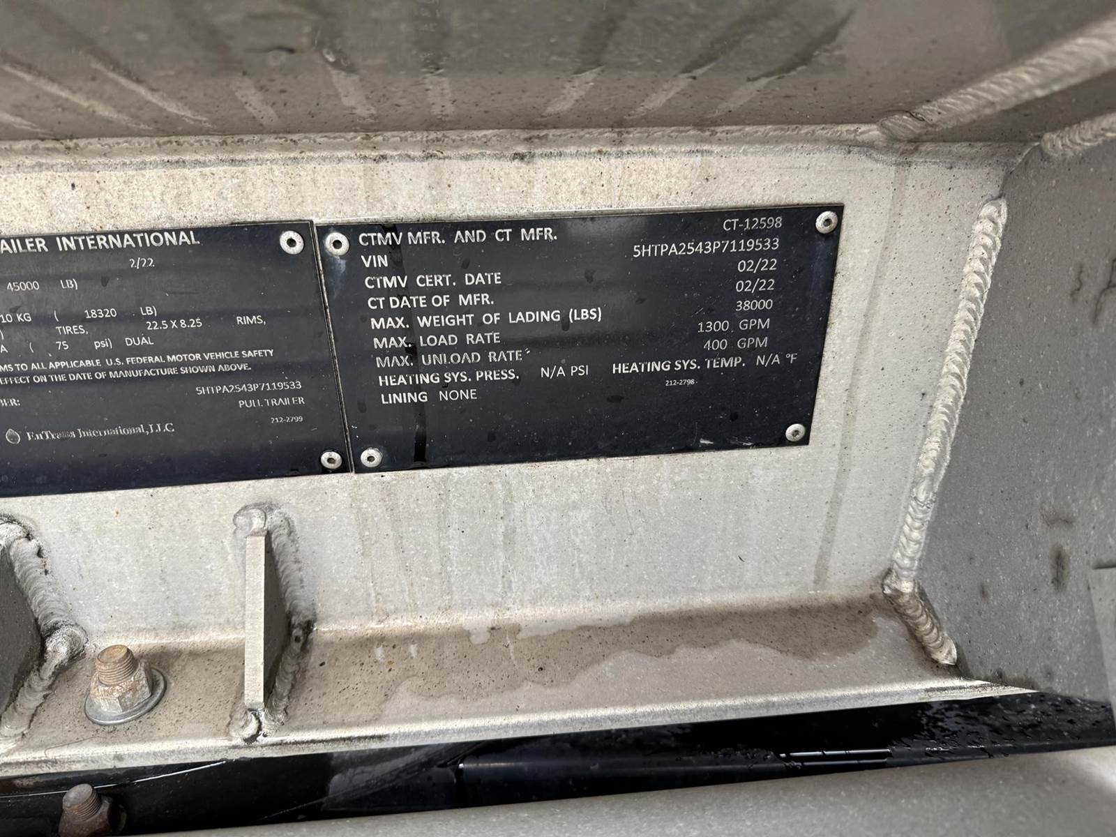 (Mfg. 6/22), DOT406AL, 9500 Gallon, 4-Compartment (3500,2100,1100,2800), All Double Bulkhead, Civacontrol Air Operated Internals, 4" API Combo Bottom Load/Unload Heads, Roto Tags, Work Light, (2) Vapor Recoveries @ Load Heads, Brake Interlock Bar, Off Side Gravity Drops & Vapor Recovery, Civacon ROM II Overfill Monitor, Civacon Optic & Thermistor, Jost Crank Style Landing Gear, Hendrickson Intraax Air Ride Suspension, 11R22.5 Tires on All Aluminum Wheels, Tire Inflation System, Disk Brakes, Aluminum Fenders, (4) Stacked R/H Hose Tubes, R/H Aluminum Fitting Box, R/H Aluminum Cone & Bucket Holder, Aluminum Ladder @ Rear of Trailer…