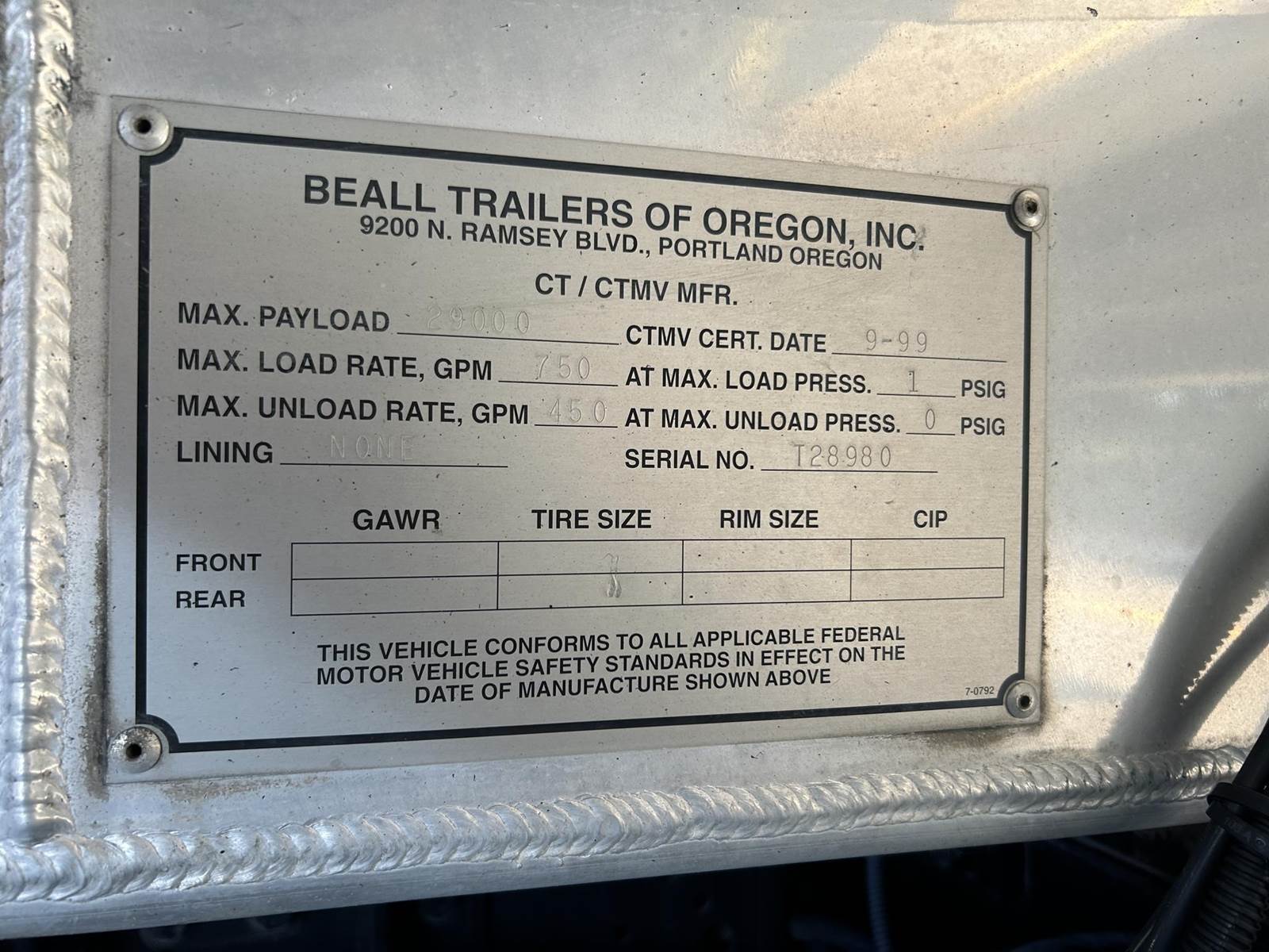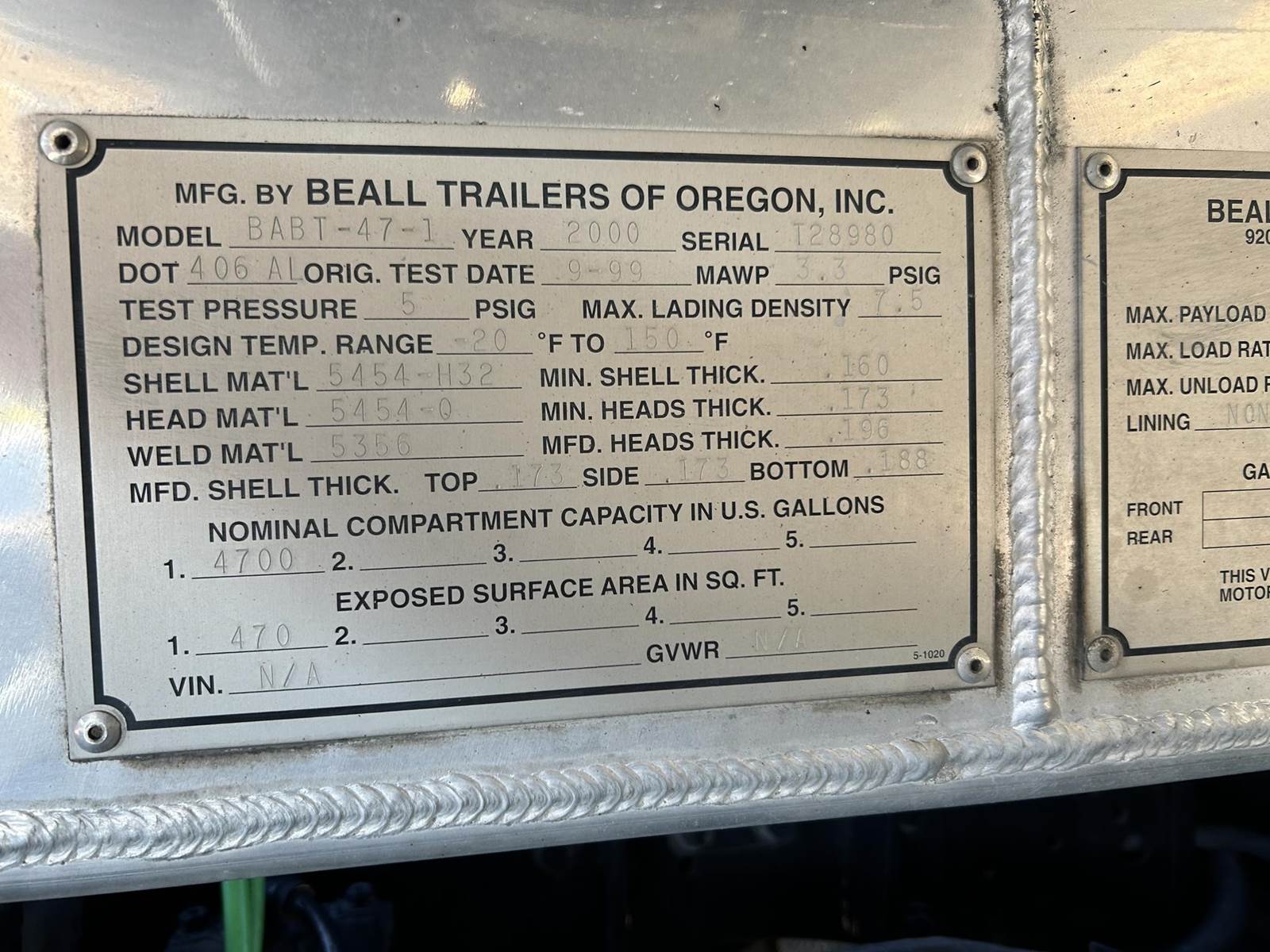 (Mfg. 9/99), Serial# T28980, Model# BABT-47-1, DOT406AL, 4700 Gallons, Single Compartment, Air Operated Internals, 4" API 'Y' Bottom Load Head w/ Brake Interlock & Sight Glass, Roto tag, Work Light @ Load Head, Vapor Recovery w/ Brake Interlock, FloTech Overfill Monitor, Optic Socket, 3" Rear Pump Line, Offside Gravity Drop & Vapor Recovery, L/H Hose Tube, (2) R/H Stacked hose Tubes w/ Fitting Box @ End, R/H Stick Tube, Aluminum Ladder @ Rear of Tank....