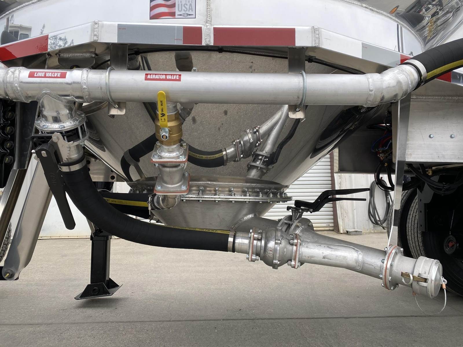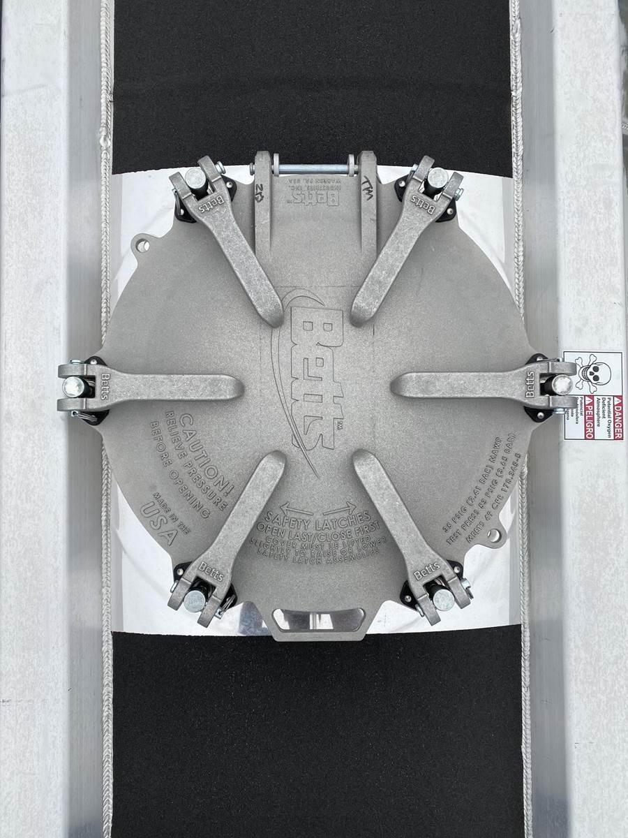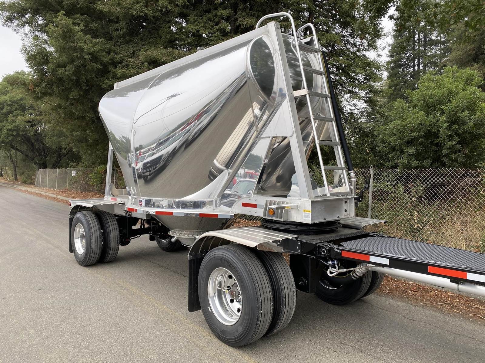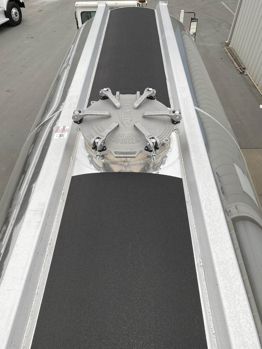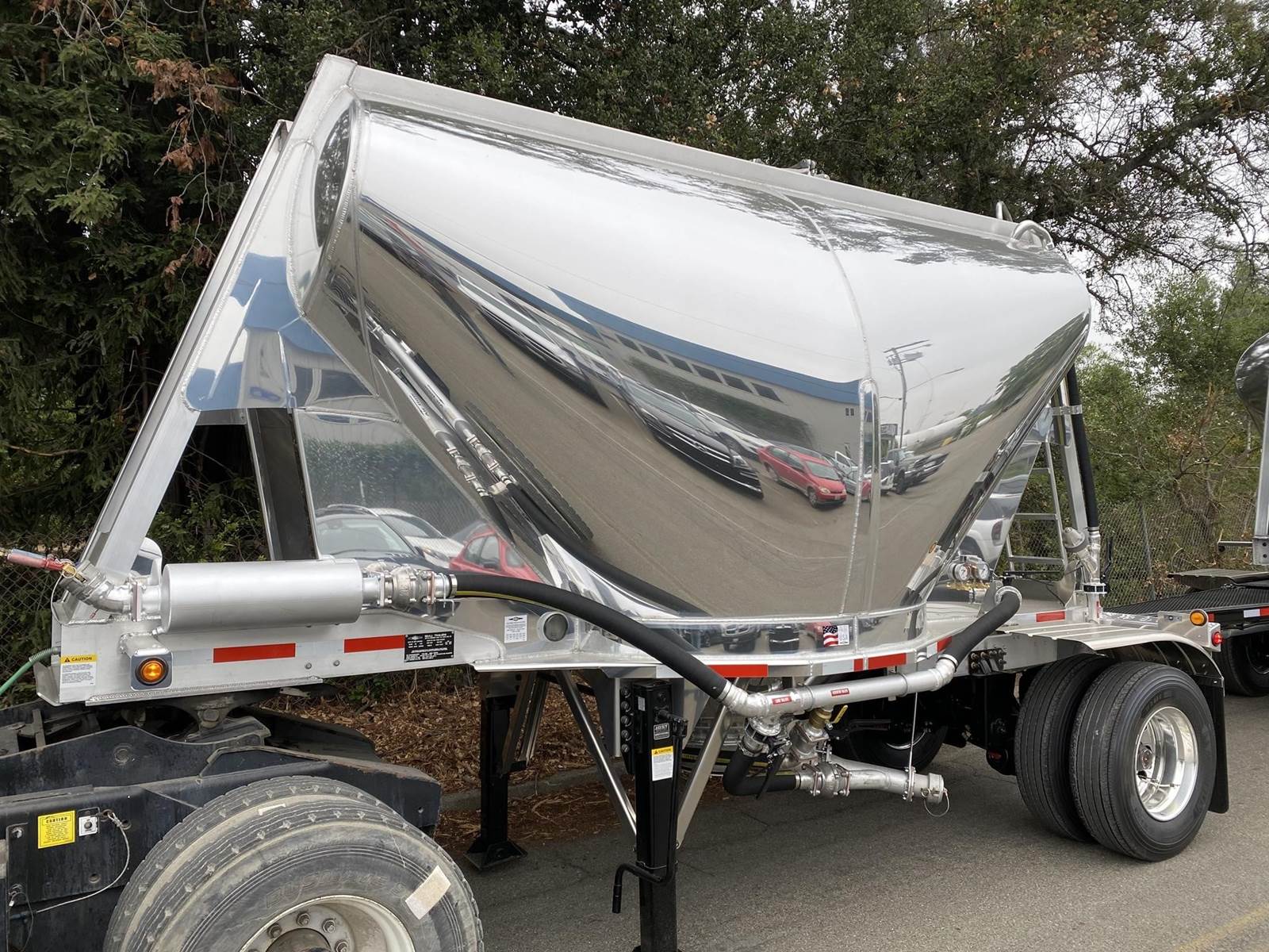 550 cubic feet capacity, all aluminum construction, Beall fabric aeration with 2" ball valve control and (1) 2" check valve (no top air), 5" x 4" aluminum discharge y-branch with 5" butterfly valve, angled 45 degrees to street-side front, Terminate with 4" female coupler and plug, double ball race turn table, (4) ribbed aluminum fenders, (2) Hendrickson Intraax AANT 23,000# RTR assemblies, RoadX 11R22.5 tires on 10 stud hub pilot aluminum wheels, Hendrickson Tiremaax CP inflation system, 2” X 4” X 1/8” rectangular steel tubing with steel mesh walkway, (2) double bushed hinge assemblies, (1) premier shock housing with hardened eye, (1) single step located street-side rear...