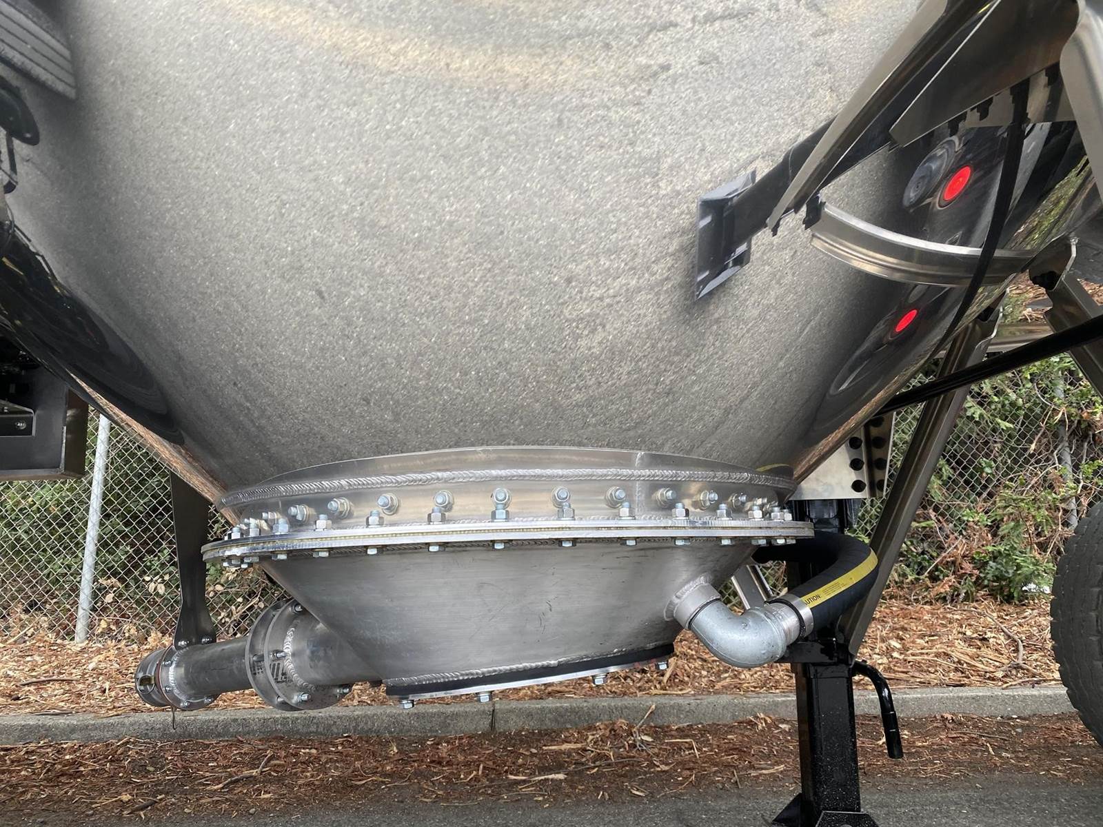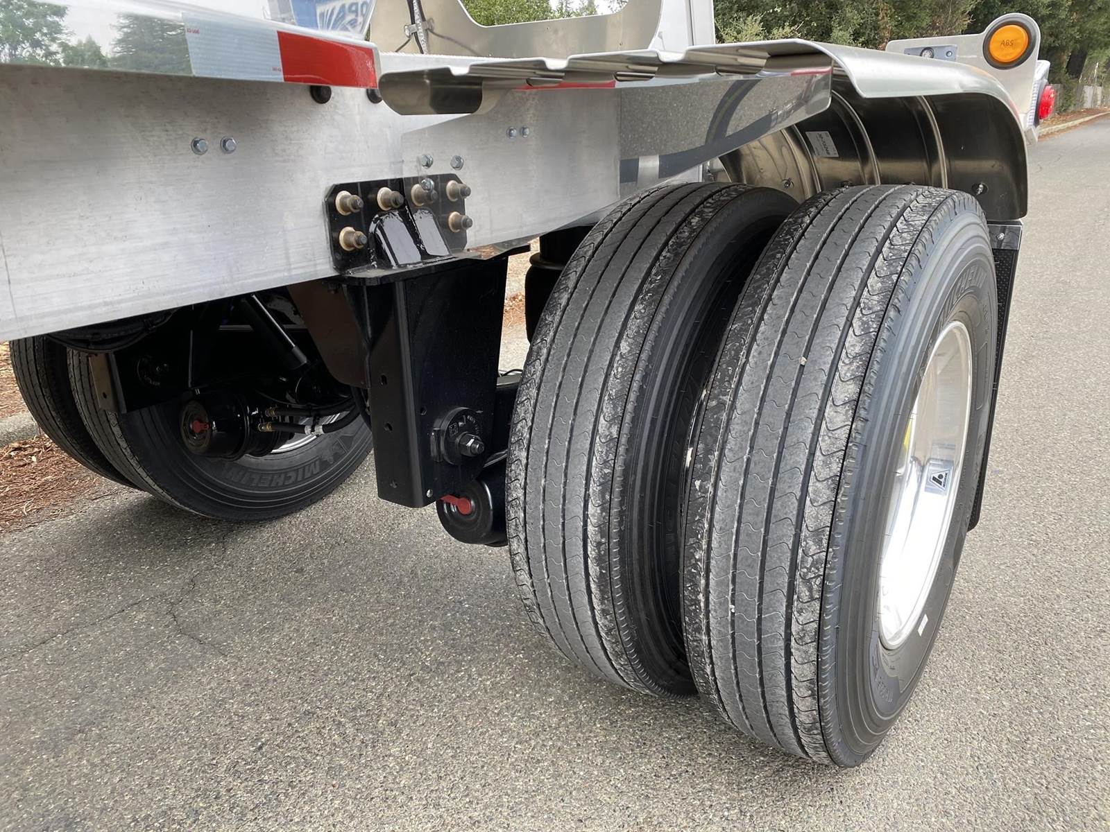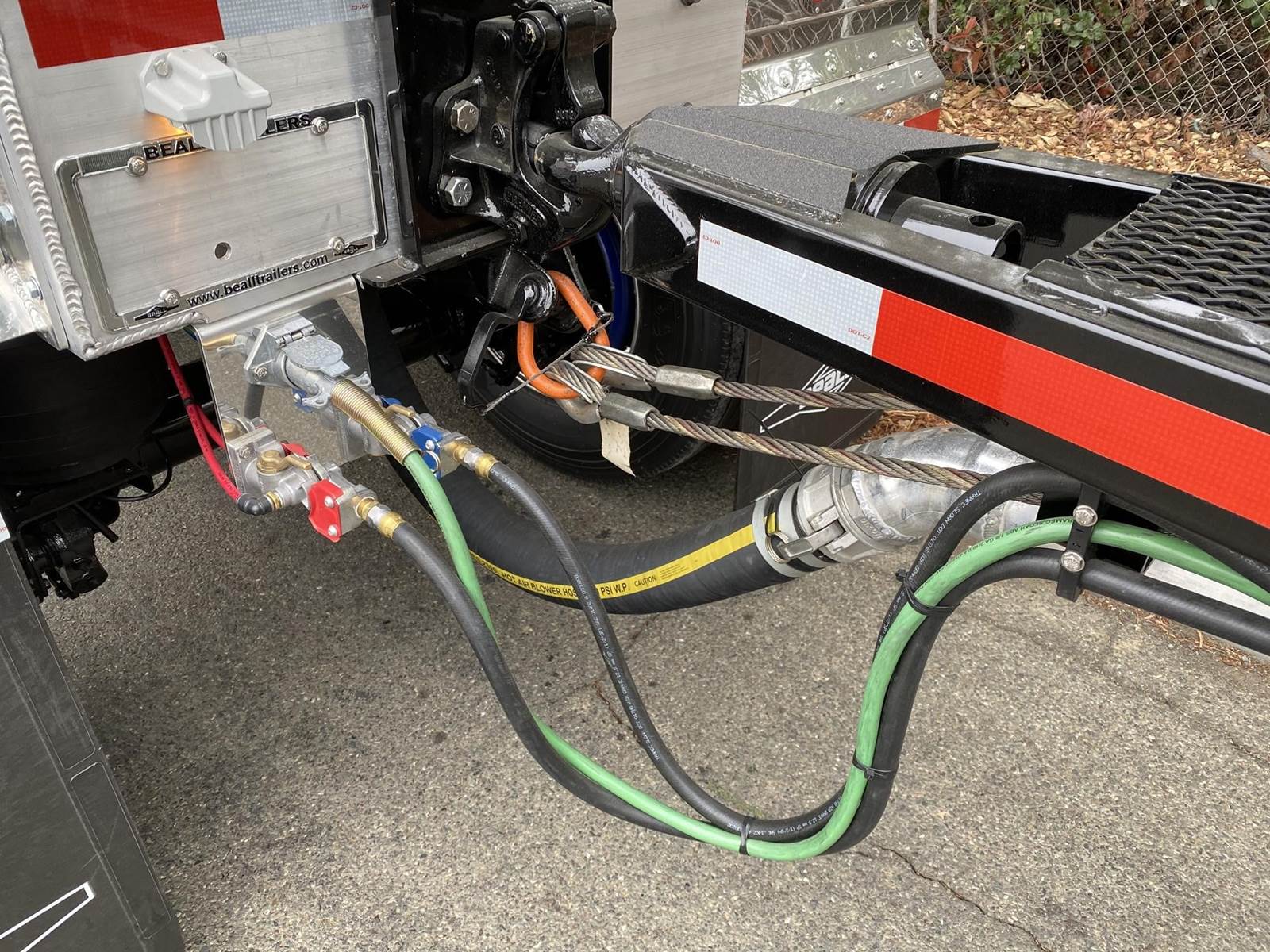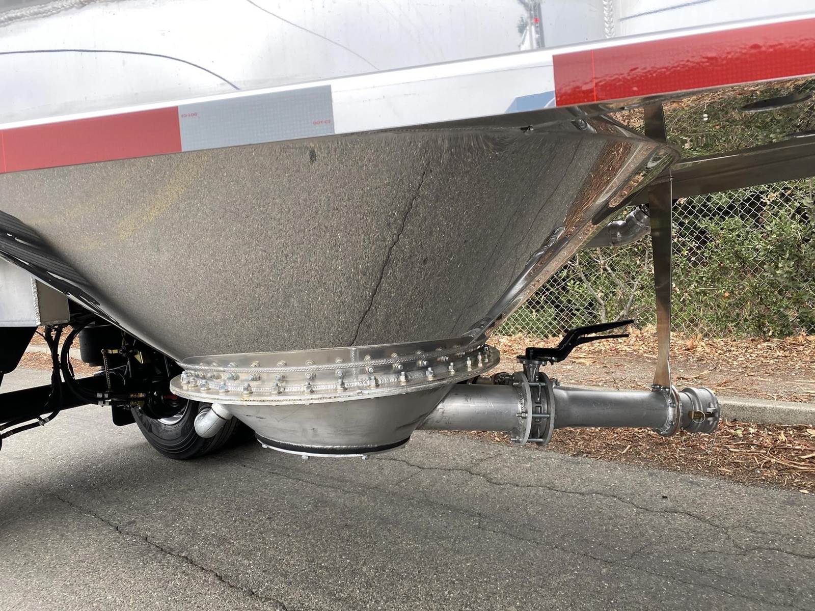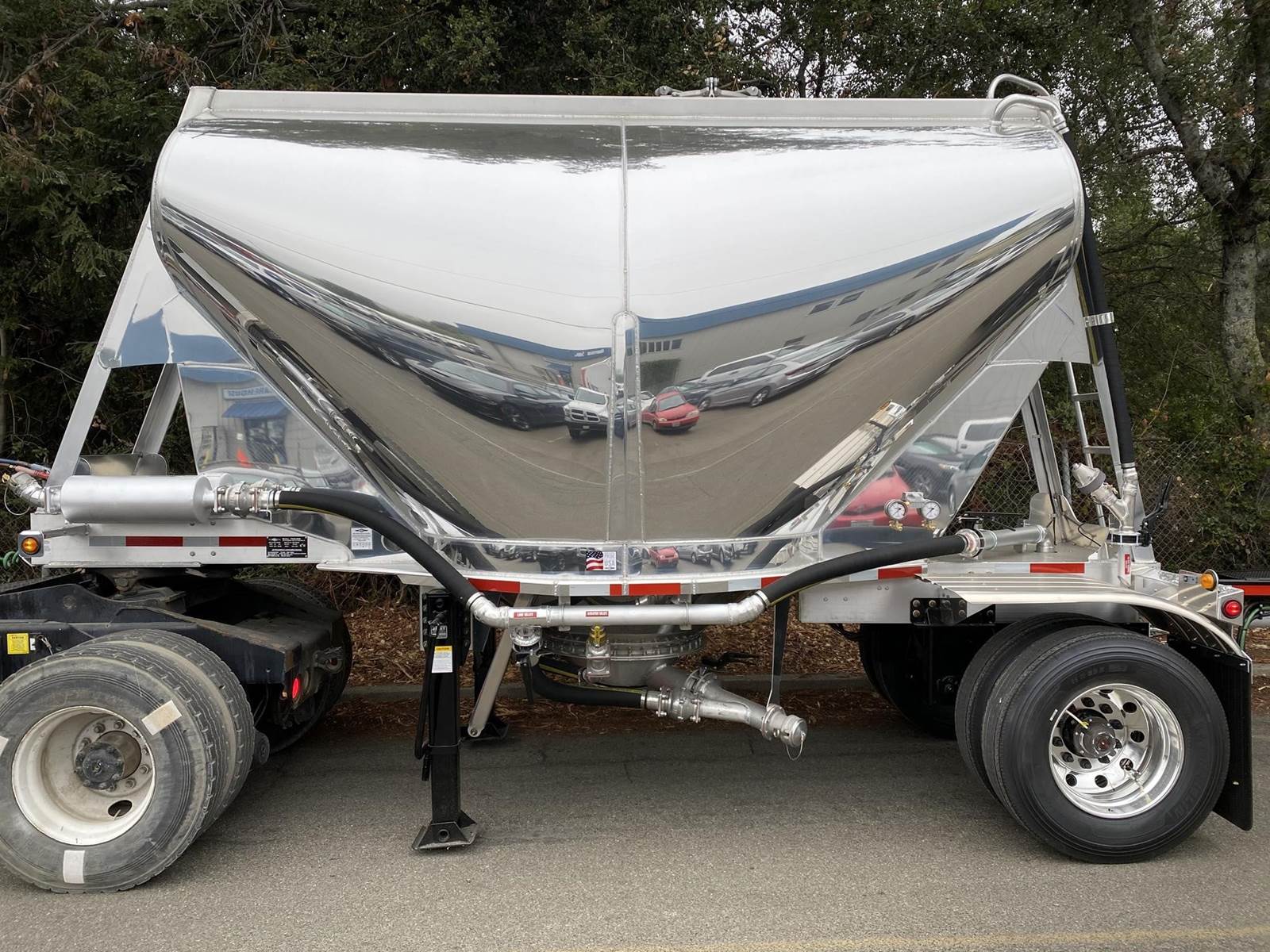 550 cubic feet capacity, all aluminum construction, Beall fabric aeration with 2" ball valve control and (1) 2" check valve (no top air), 5" x 4" aluminum discharge y-branch with 5" butterfly valve, angled 45 degrees to street-side rear, Terminate with 4" female coupler and plug, 3" silencer installed downstream of street-side air inlet, (2) ribbed aluminum fenders over rear axle, (1) Hendrickson Intraax AANT 23,000# RTR assemblies, RoadX 11R22.5 tires on 10 stud hub pilot aluminum wheels, Hendrickson Tiremaax CP inflation system, Jost two-speed with sand shoes, pintle hitch at rear…