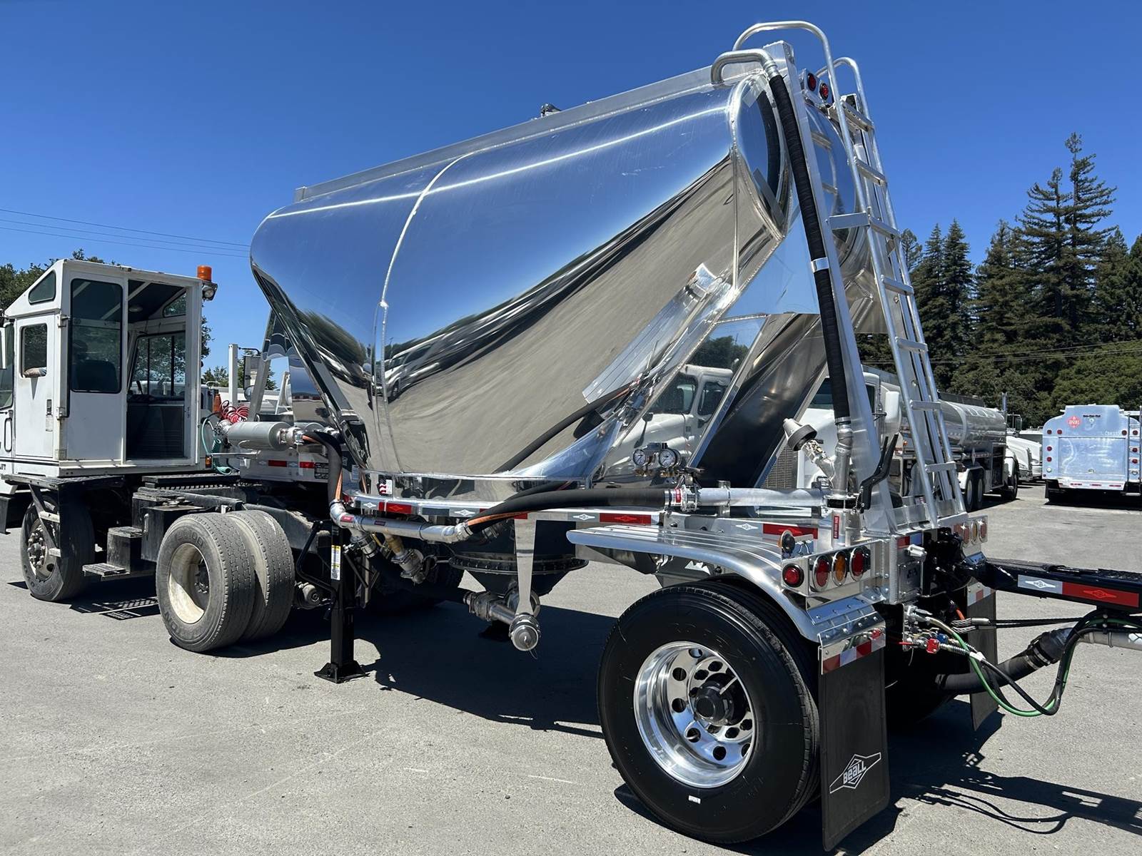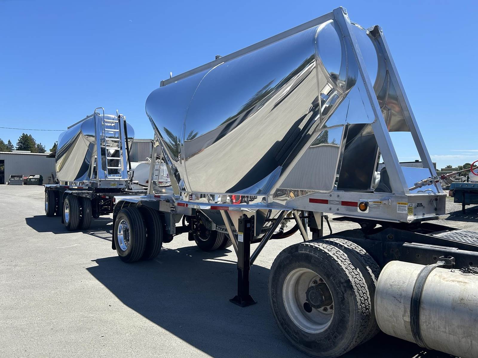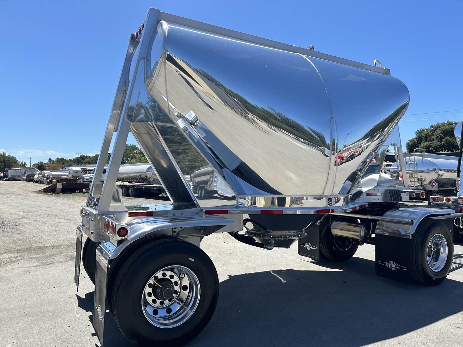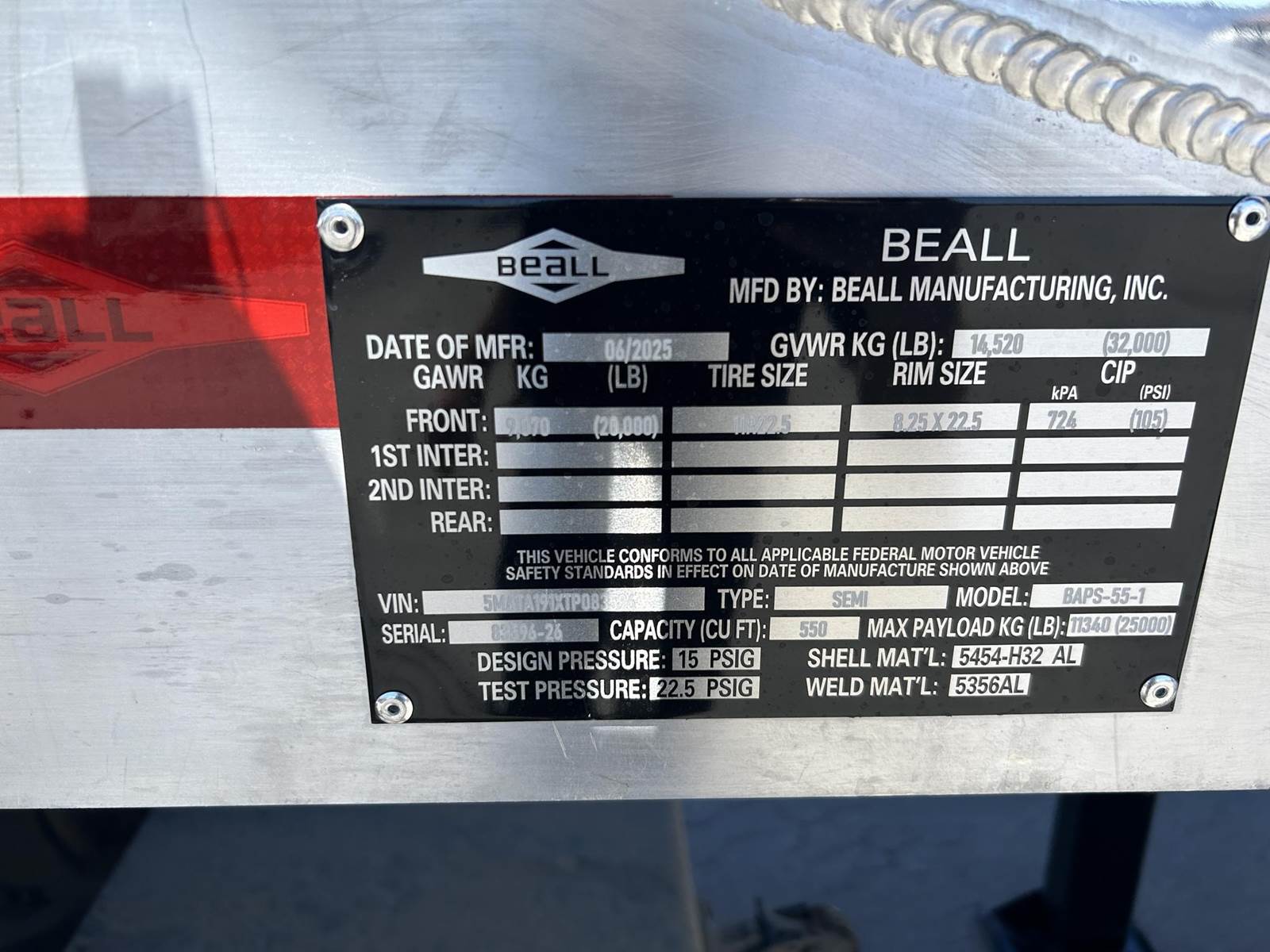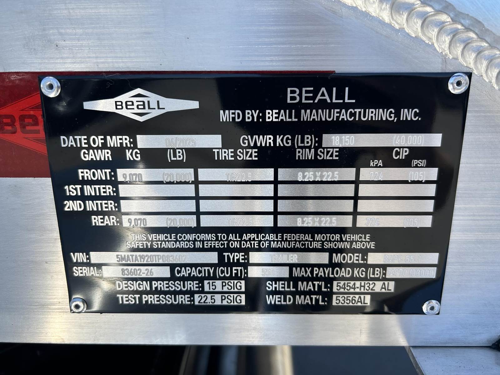 550 cubic feet capacity, all aluminum construction, Beall fabric aeration with 2" ball valve control and (1) 2" check valve (no top air), 5" x 4" aluminum discharge y-branch with 5" butterfly valve, angled 45 degrees to street-side front, Terminate with 4" female coupler and plug, double ball race turn table, (4) ribbed aluminum fenders, (2) Hendrickson Intraax AANT 23,000# RTR assemblies, RoadX 11R22.5 tires on 10 stud hub pilot aluminum wheels, Hendrickson Tiremaax CP inflation system, 2” X 4” X 1/8” rectangular steel tubing with steel mesh walkway, (2) double bushed hinge assemblies, (1) premier shock housing with hardened eye, (1) single step located street-side rear