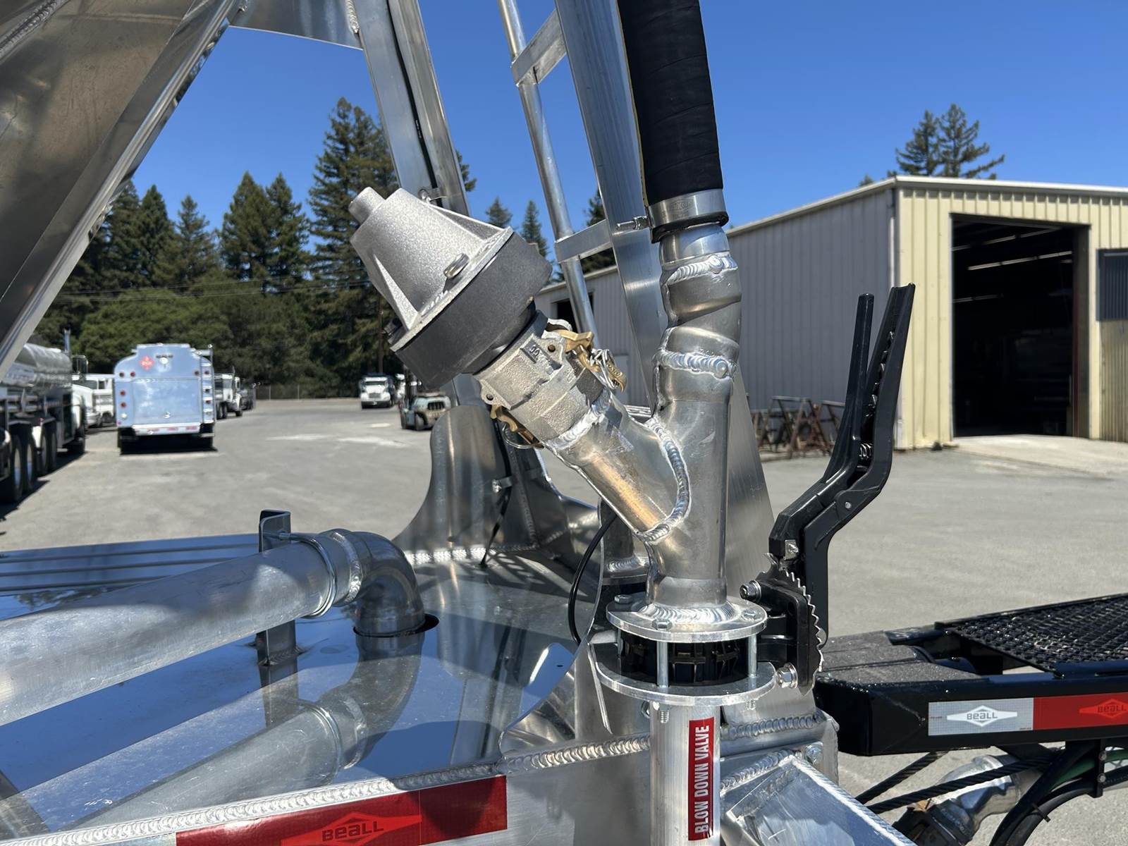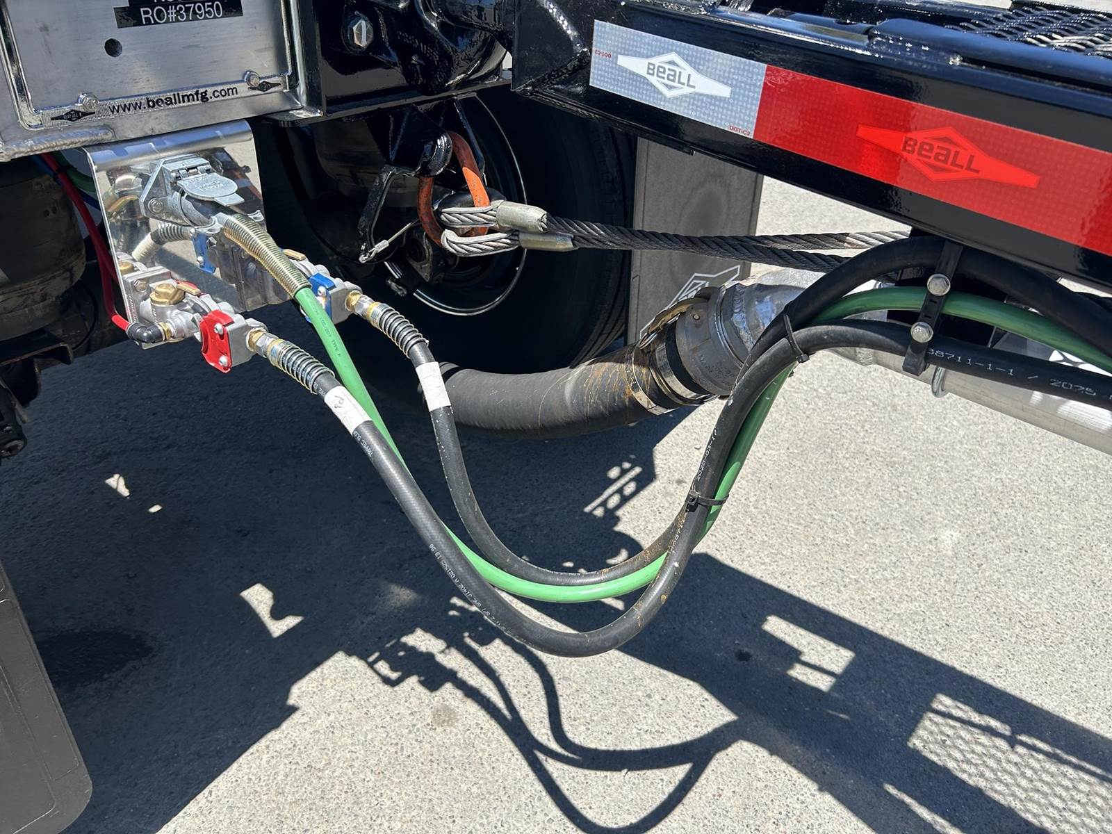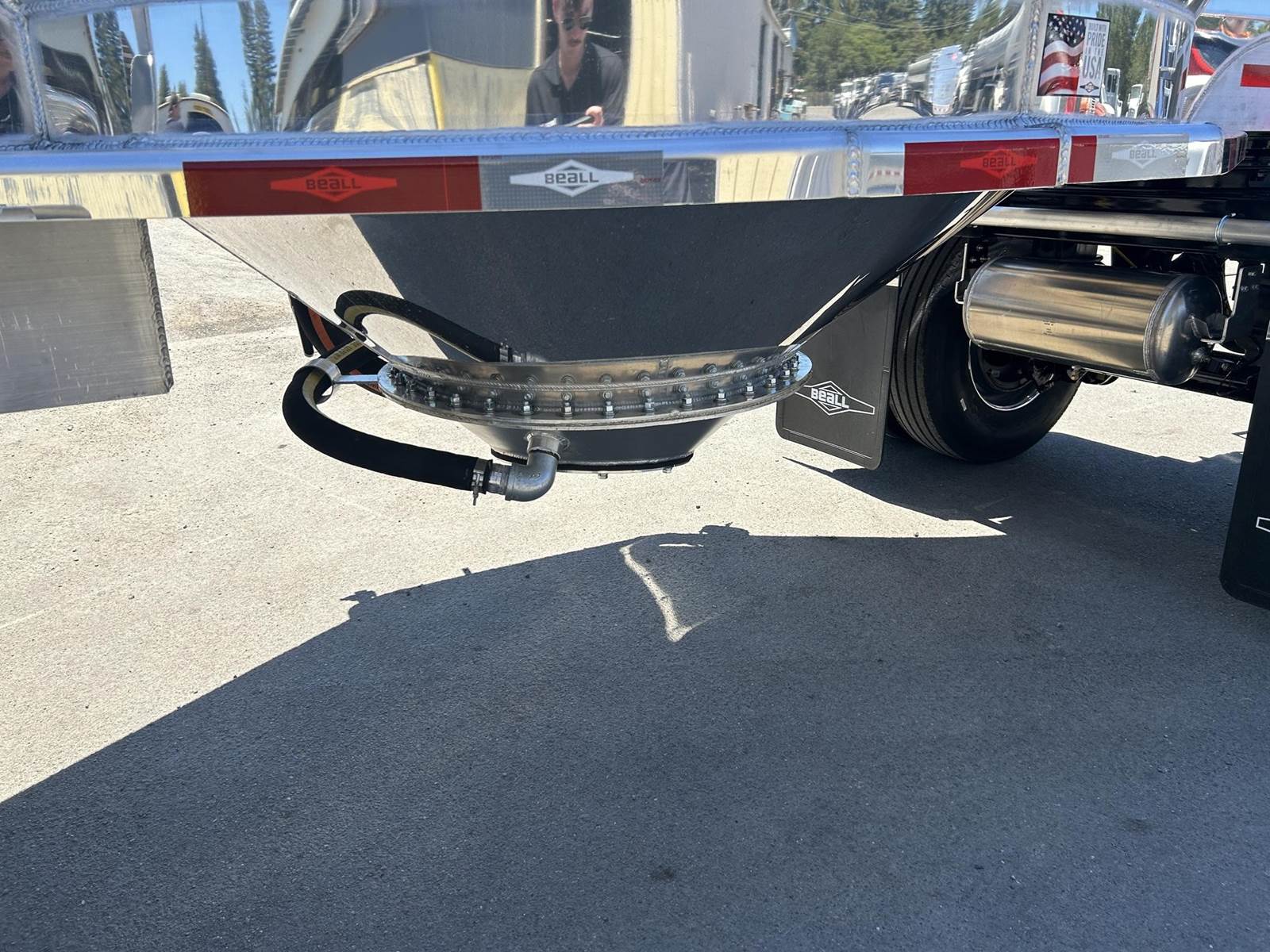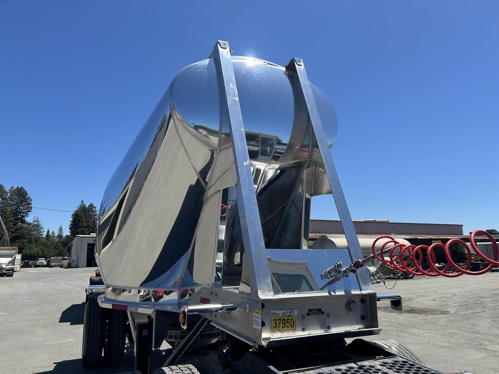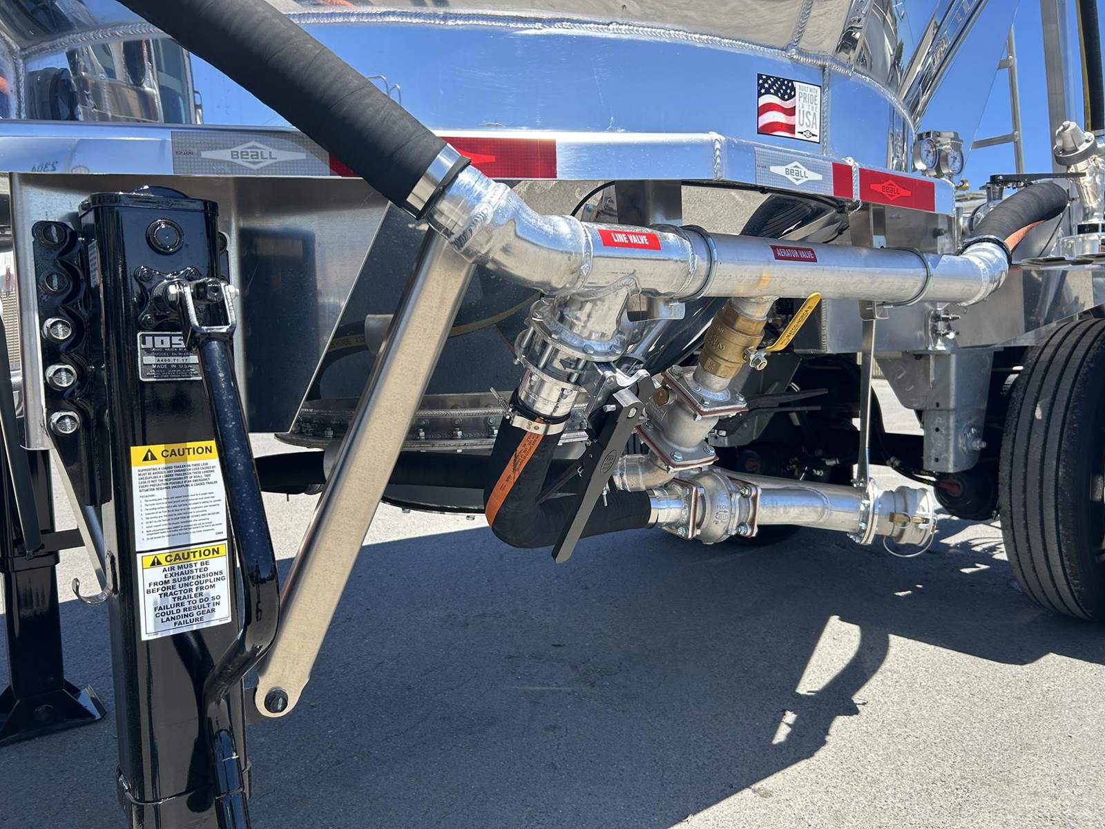 550 cubic feet capacity, all aluminum construction, Beall fabric aeration with 2" ball valve control and (1) 2" check valve (no top air), 5" x 4" aluminum discharge y-branch with 5" butterfly valve, angled 45 degrees to street-side front, Terminate with 4" female coupler and plug, double ball race turn table, (4) ribbed aluminum fenders, (2) Hendrickson Intraax AANT 23,000# RTR assemblies, RoadX 11R22.5 tires on 10 stud hub pilot aluminum wheels, Hendrickson Tiremaax CP inflation system, 2” X 4” X 1/8” rectangular steel tubing with steel mesh walkway, (2) double bushed hinge assemblies, (1) premier shock housing with hardened eye, (1) single step located street-side rear
