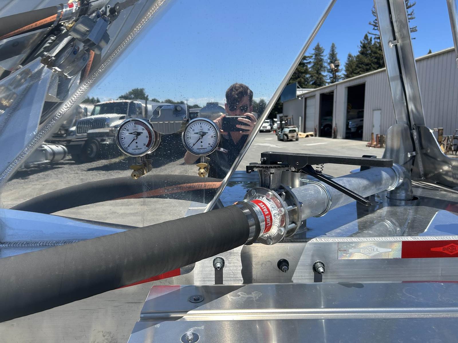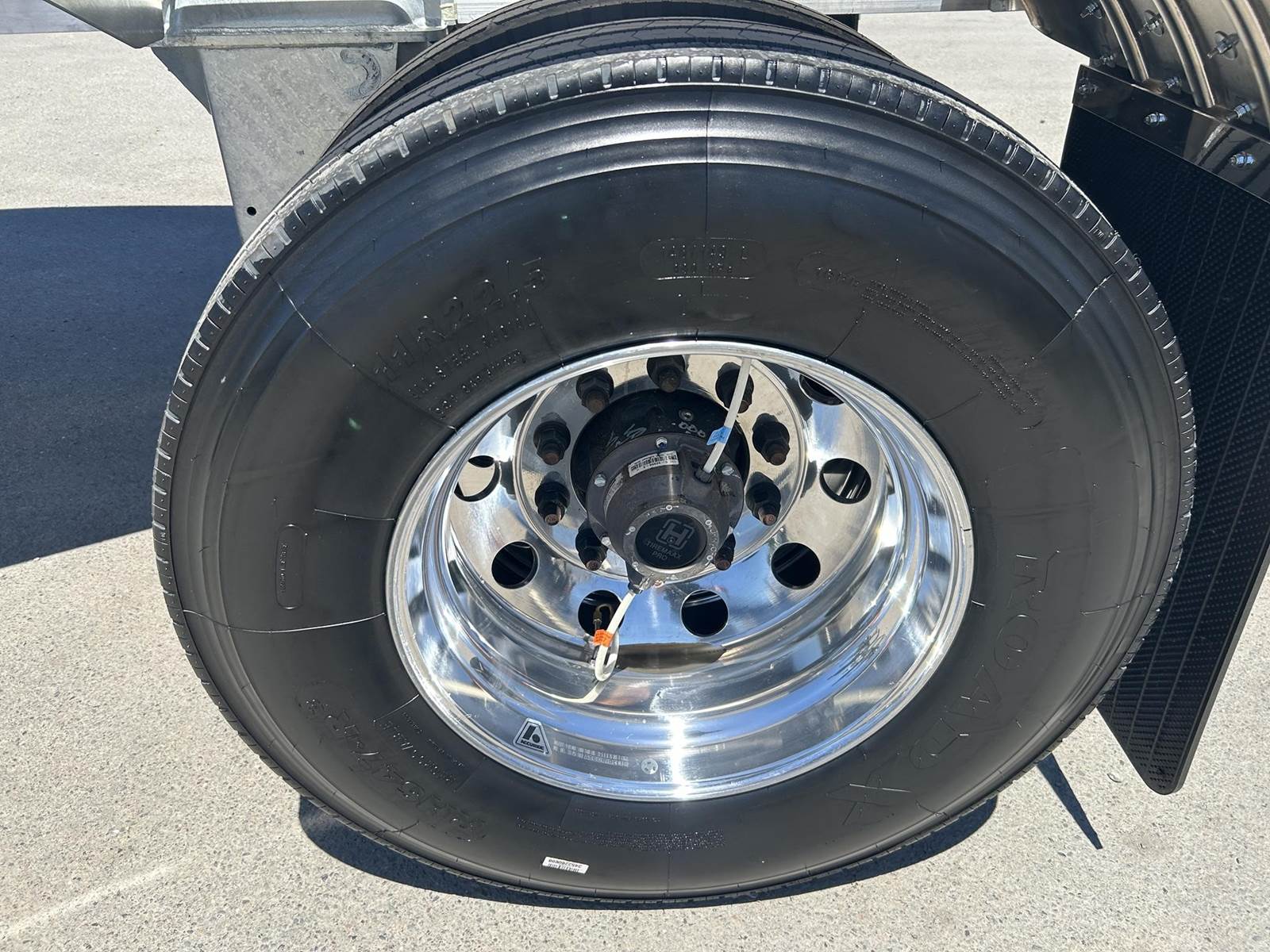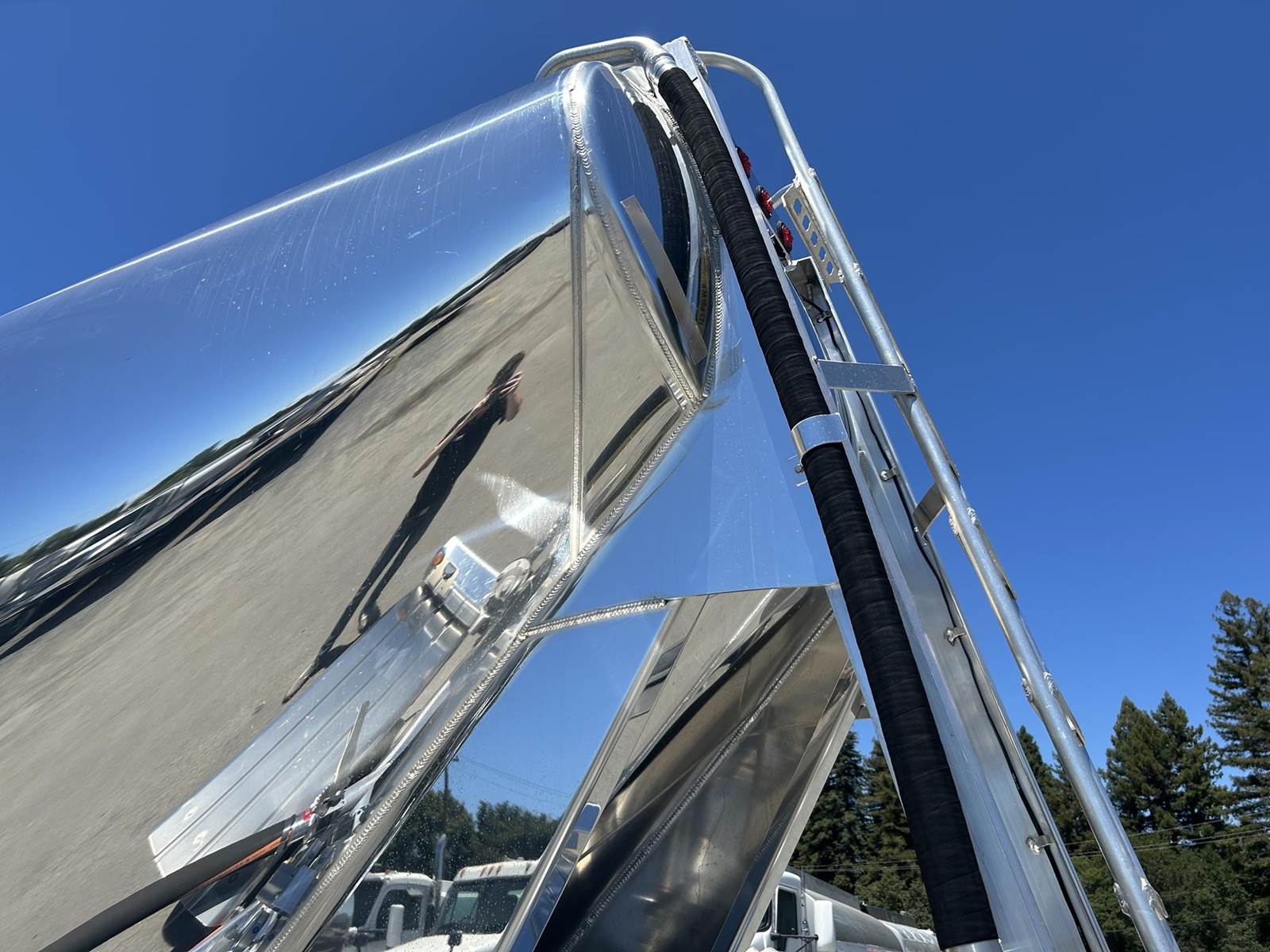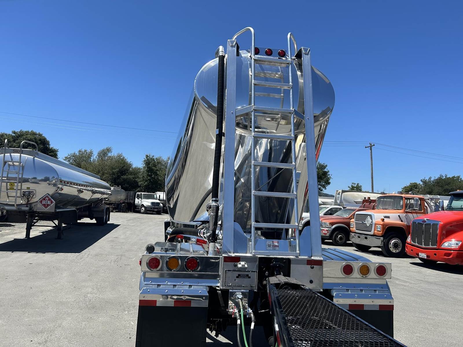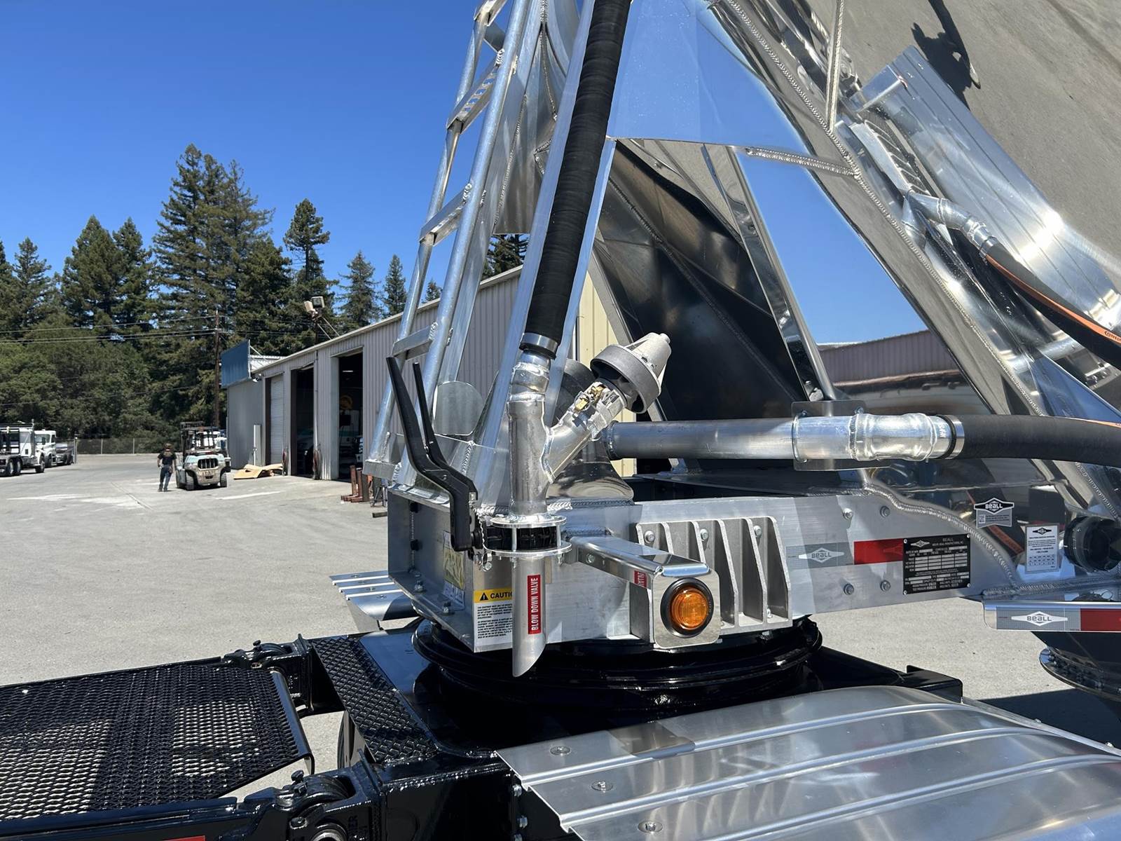 550 cubic feet capacity, all aluminum construction, Beall fabric aeration with 2" ball valve control and (1) 2" check valve (no top air), 5" x 4" aluminum discharge y-branch with 5" butterfly valve, angled 45 degrees to street-side front, Terminate with 4" female coupler and plug, double ball race turn table, (4) ribbed aluminum fenders, (2) Hendrickson Intraax AANT 23,000# RTR assemblies, RoadX 11R22.5 tires on 10 stud hub pilot aluminum wheels, Hendrickson Tiremaax CP inflation system, 2” X 4” X 1/8” rectangular steel tubing with steel mesh walkway, (2) double bushed hinge assemblies, (1) premier shock housing with hardened eye, (1) single step located street-side rear