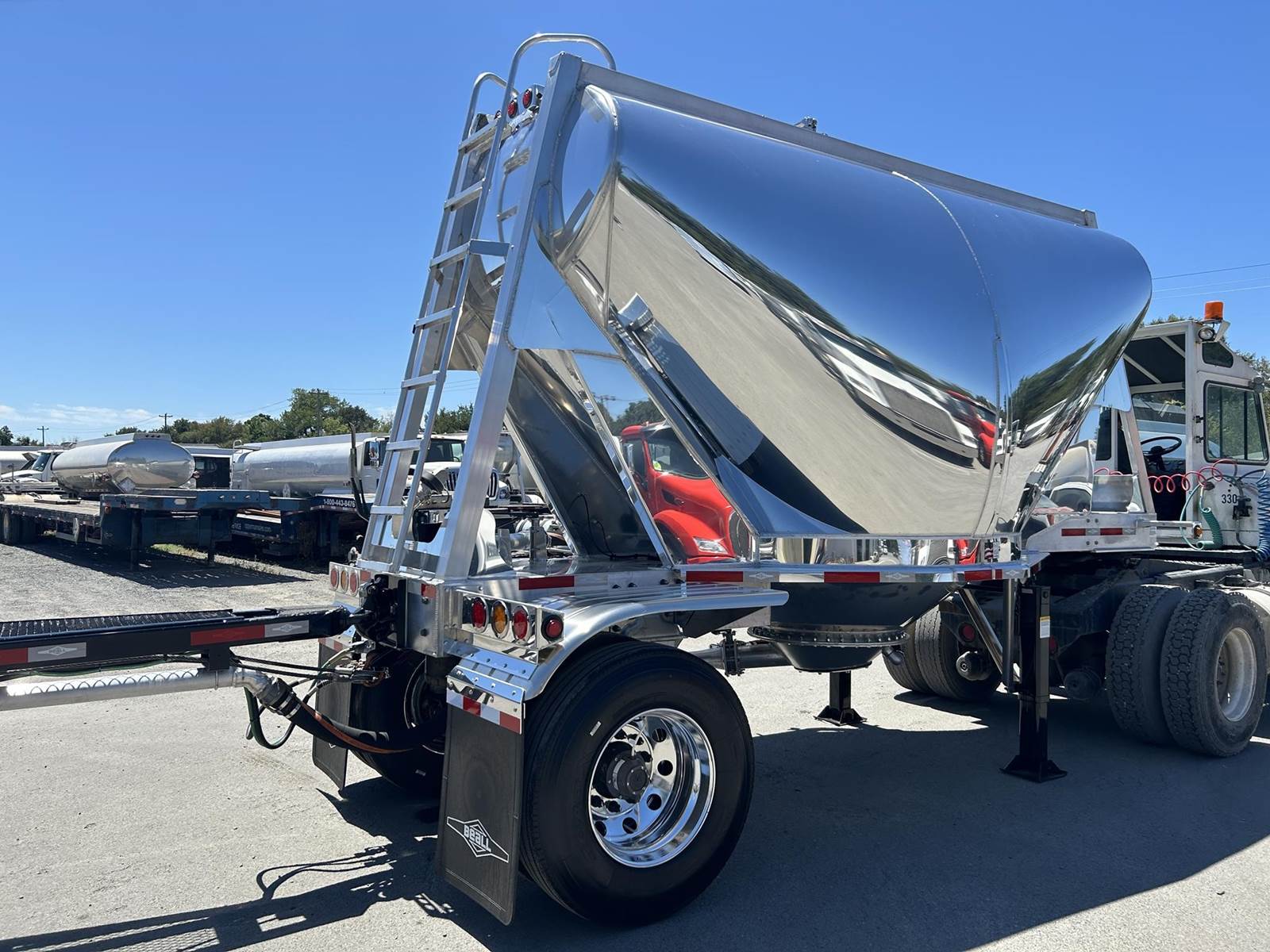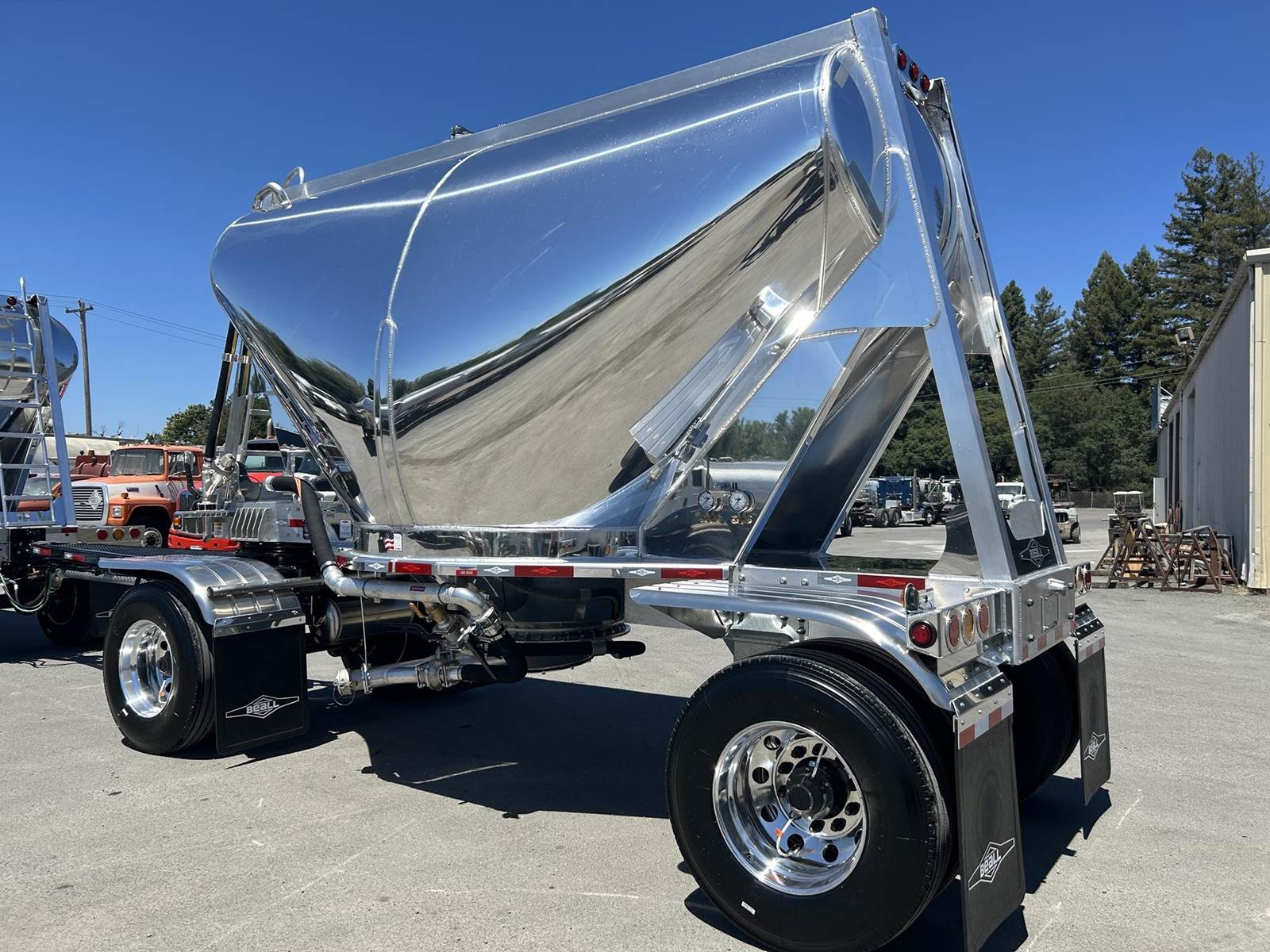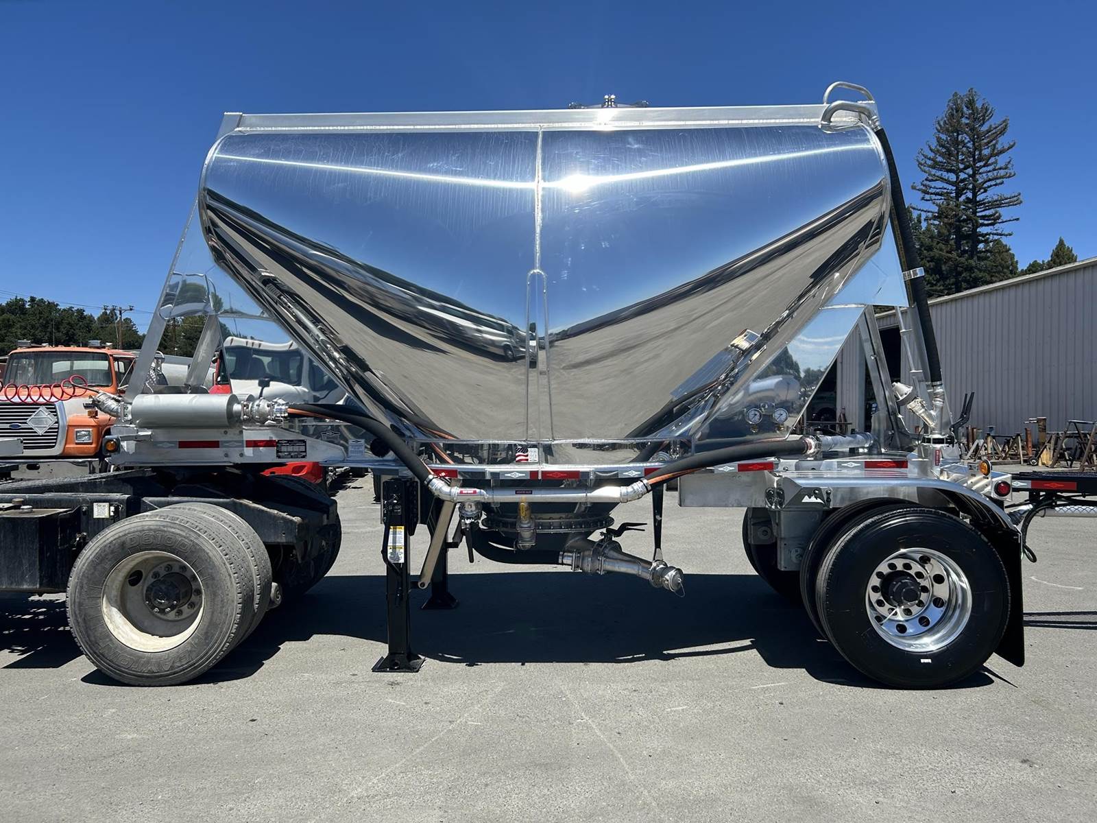 550 cubic feet capacity, all aluminum construction, Beall fabric aeration with 2" ball valve control and (1) 2" check valve (no top air), 5" x 4" aluminum discharge y-branch with 5" butterfly valve, angled 45 degrees to street-side rear, Terminate with 4" female coupler and plug, 3" silencer installed downstream of street-side air inlet, (2) ribbed aluminum fenders over rear axle, (1) Hendrickson Intraax AANT 23,000# RTR assemblies, RoadX 11R22.5 tires on 10 stud hub pilot aluminum wheels, Hendrickson Tiremaax CP inflation system, Jost two-speed with sand shoes, pintle hitch at rear…